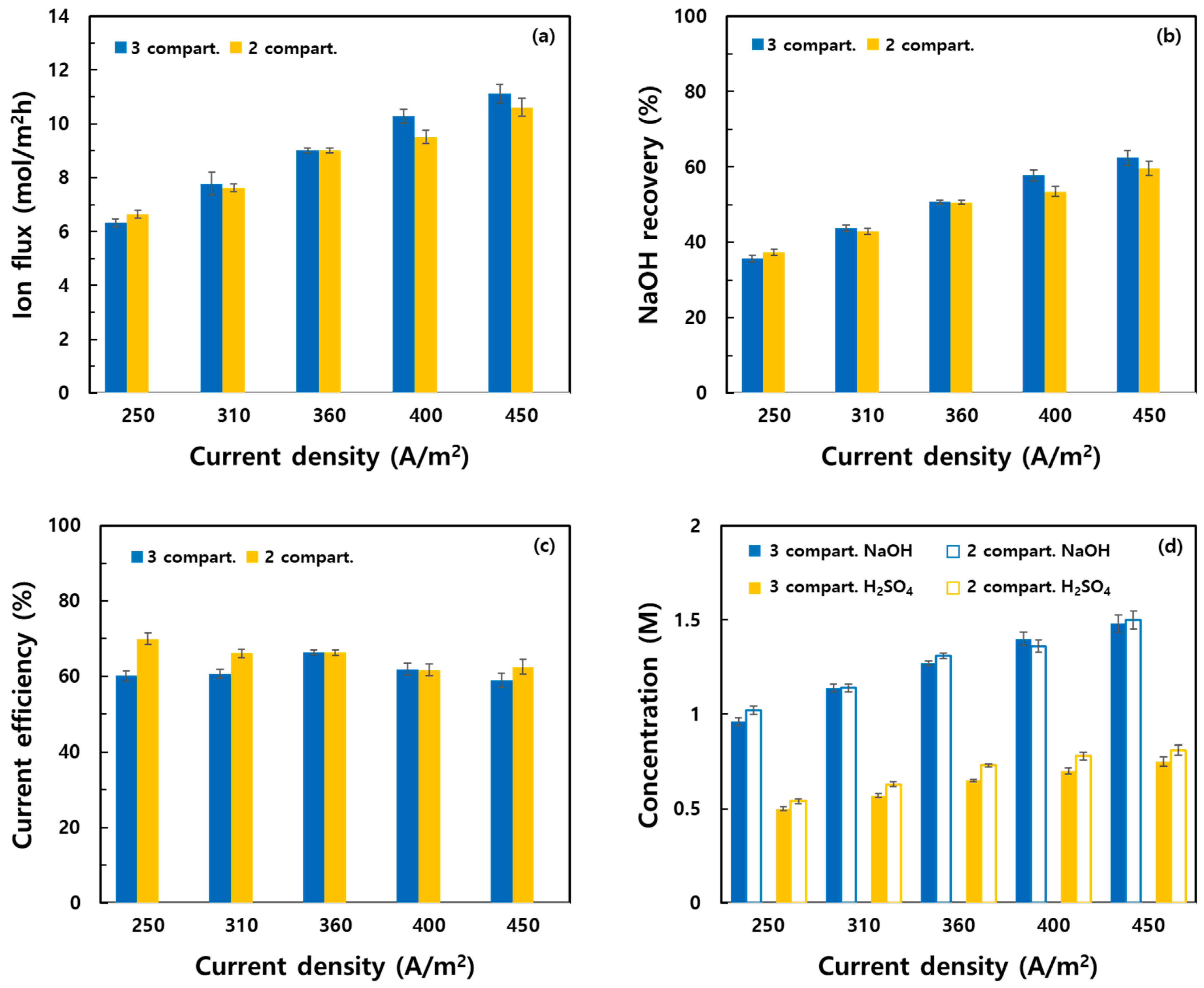- With increasing current density, the Na+ flux, NaOH recovery rate, and energy consumption increased. In most cases, the three-compartment system outperformed the two-compartment system. The CE continuously decreased in the two-compartment system, while it increased up to 360 A/m2 and then declined in the three-compartment system. This was attributed to different heat accumulation and concentration polarization effects in each system. Although the two-compartment system exhibited lower energy consumption, additional thermal control may be required for extended operations.
