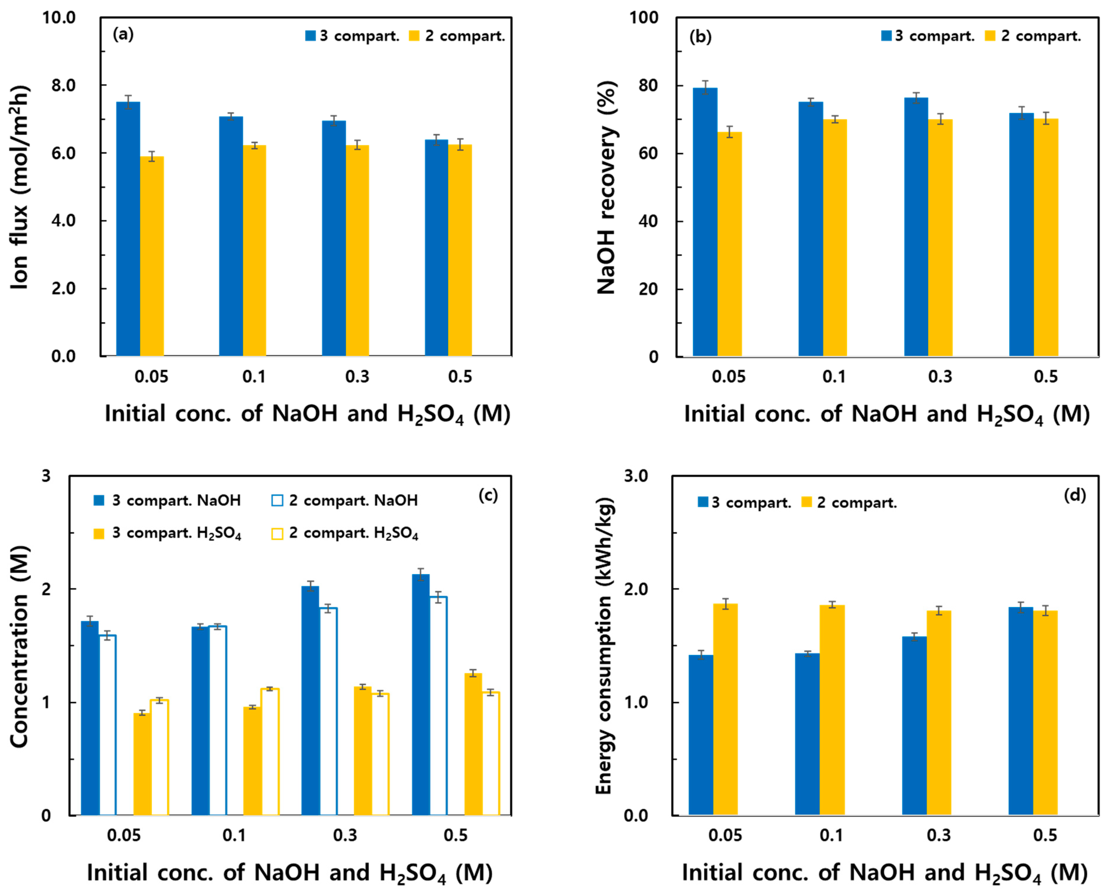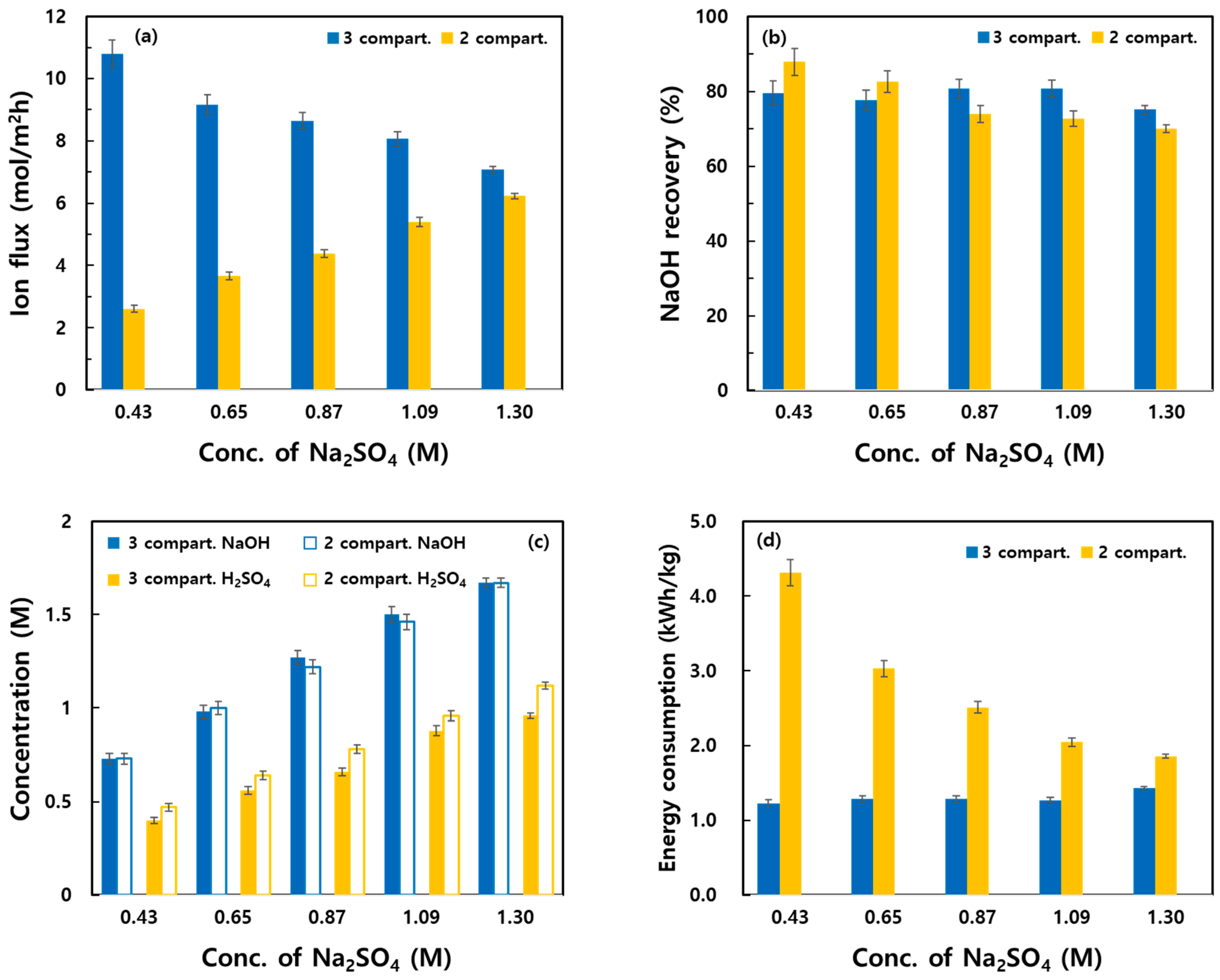 - With increasing Na2SO4 concentration, both systems exhibited higher concentrations of recovered NaOH and H2SO4 as well as improved CE. In the three-compartment system, the Na+ flux decreased owing to reduced voltage at high Na2SO4 concentrations, whereas in the two-compartment system, the flux increased owing to the weakening of the concentration polarization effect. The two-compartment system was less energy efficient at low concentrations, but it showed improved energy efficiency at high concentrations.