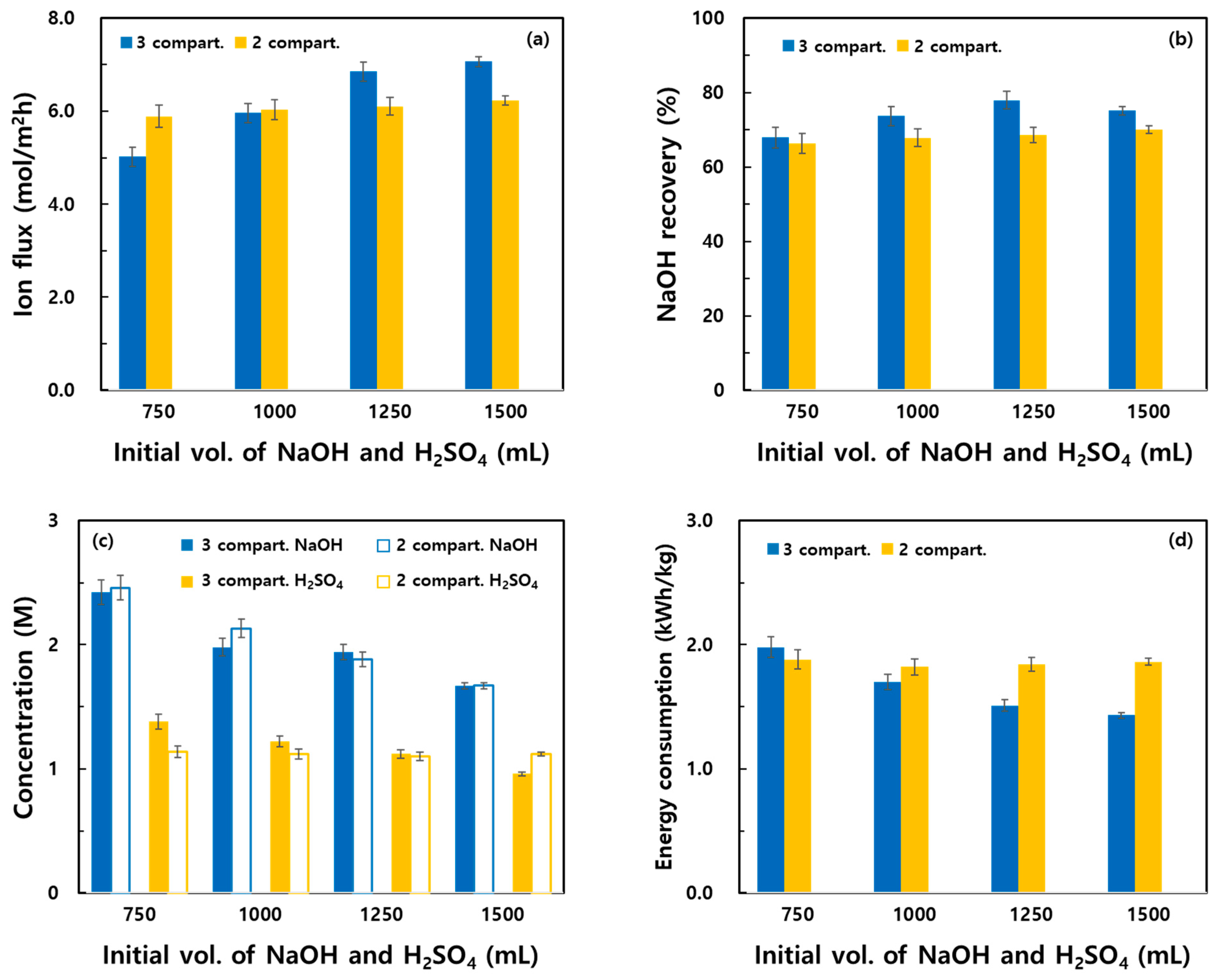 - Increasing the initial volumes of NaOH and H2SO4 in the recovery compartments increased the Na+ flux and NaOH recovery rates in both systems. At volumes of ≥1250 mL, the three-compartment system demonstrated superior recovery performance. Low initial volumes increased the concentrations of the recovered species; however, differences in the water transport and recovery rates caused variations in the final concentrations. Energy consumption substantially decreased in the three-compartment system with the increasing volumes, suggesting that volume control is critical for process optimization.