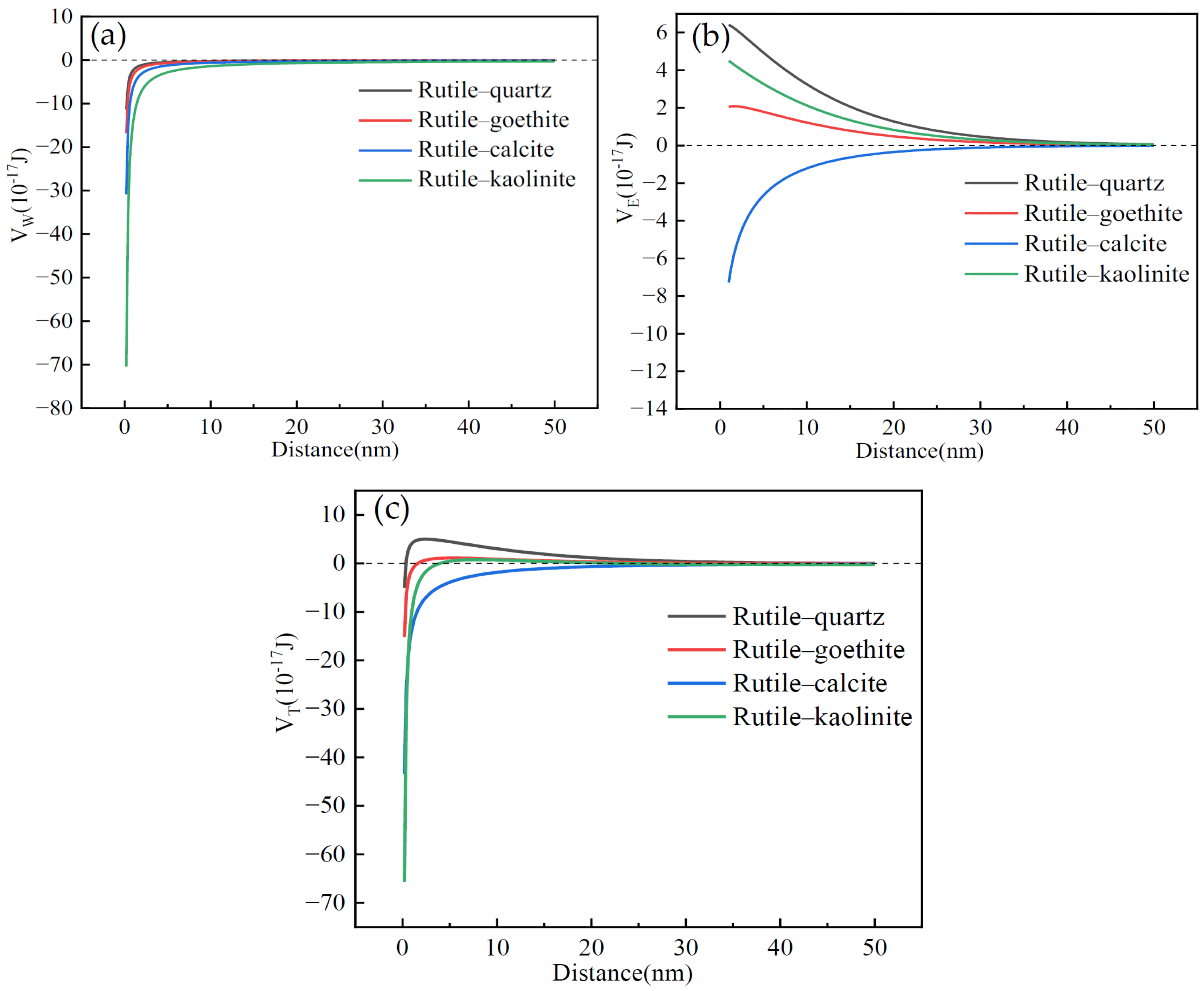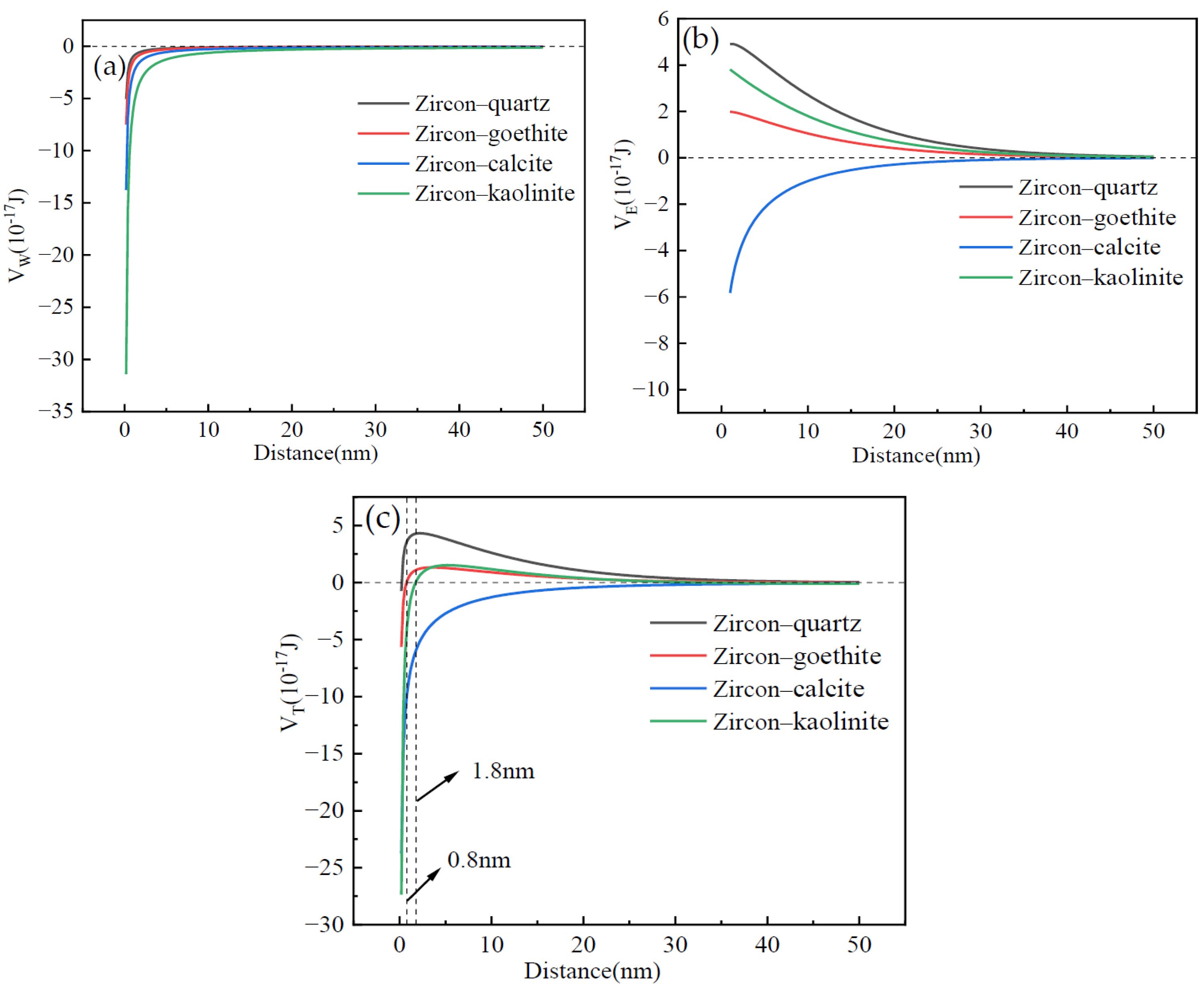 - The DLVO theoretical calculations demonstrated that the quartz was difficult to cover over the surface of zircon and rutile, whereas the calcite was prone to adhere to their surface. The covering capacity of goethite and kaolinite over the rutile was stronger than that over the zircon.