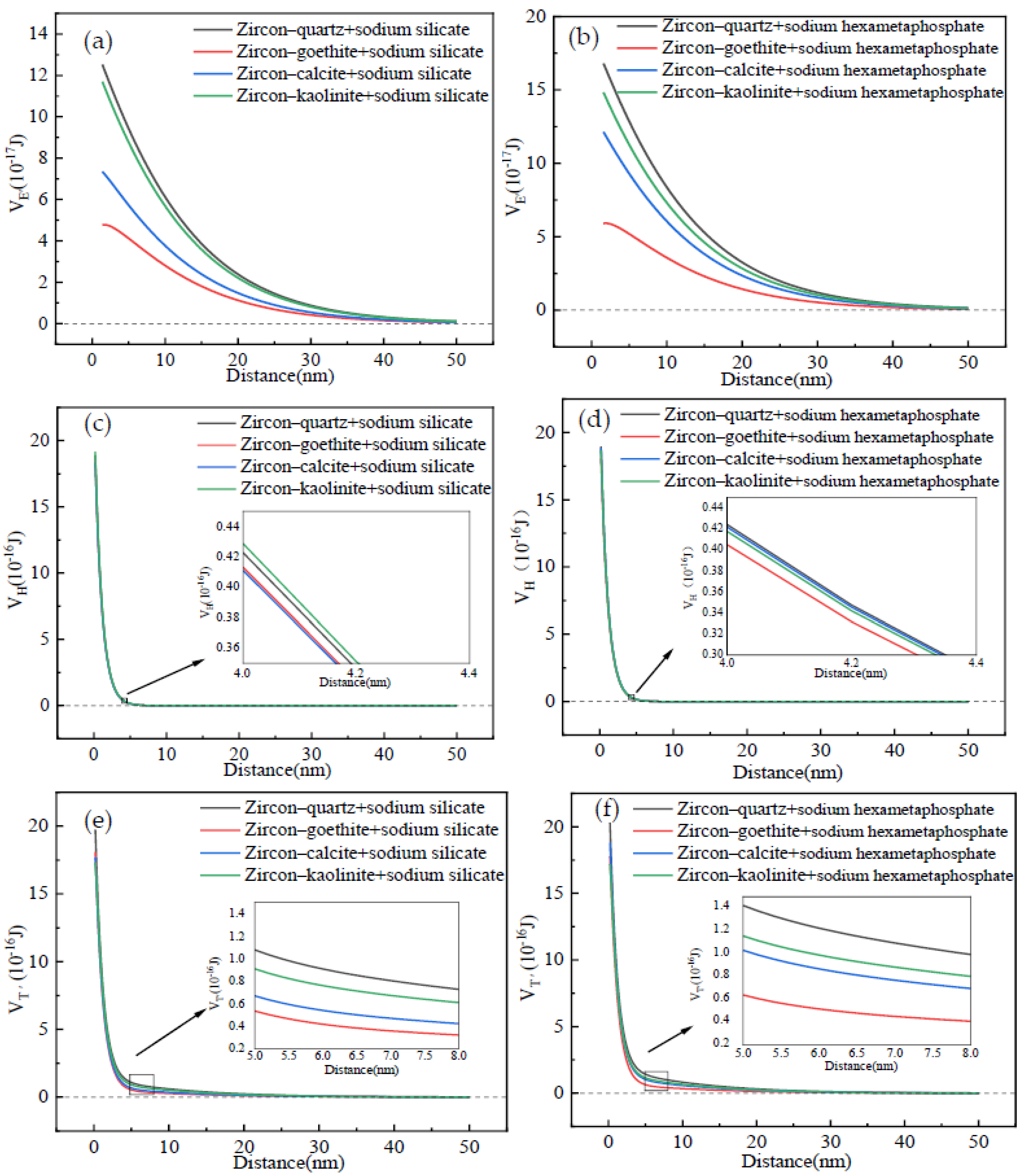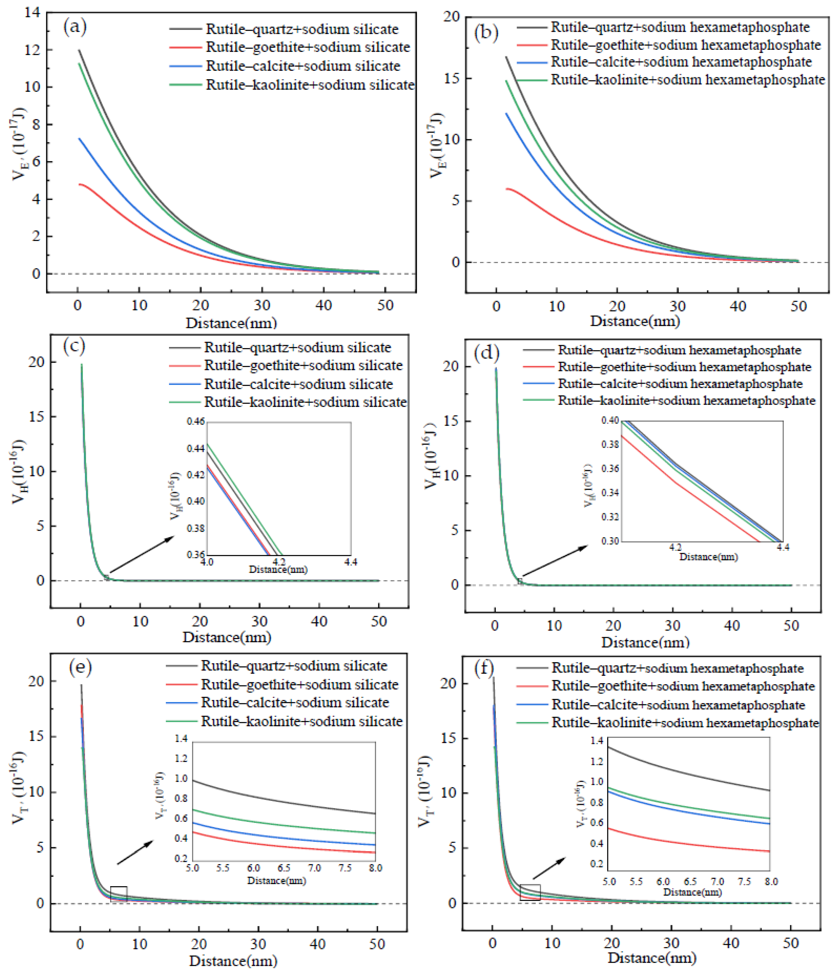 - The EDLVO theoretical calculation verified that the addition of SS or SHMP promoted detachment of the gangue from the surface of rutile and zircon. Moreover, the gangue was more prone to detach from the zircon surface in contrast with the rutile. It was also found that the VH between the zircon/rutile and gangue after adding surfactants mainly contributed to the VT′. Comparing the SHMP with the SS, dispersion performance of the former surfactant was superior. These discoveries will provide an excellent theoretical reference for effectively removing fine mud from the surface of rutile ore.