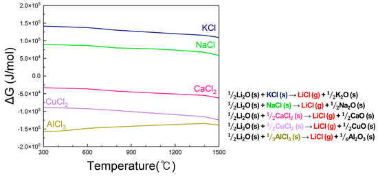 Figure 2 presents the Gibbs free energy change (ΔG) as a function of temperature for the reactions between Li2O(s) and various chlorine donors, including CaCl2, KCl, NaCl, CuCl2, and AlCl3, explicitly showing the phases of reactants and products (e.g., Li2O (s) + CaCl2 (s) → 2LiCl (g) + CaO (s)). Among these, only CaCl2 exhibits negative ΔG values, indicating that LiCl formation is spontaneous and thermodynamically favorable. In contrast, KCl and NaCl show positive ΔG values, while AlCl3 and CuCl2 are less suitable due to volatility or cost limitations. Therefore, CaCl2 was selected as the most effective chlorine donor in this study. The Gibbs free energy for the formation of 1 mol of LiCl was calculated to compare their thermodynamic feasibility.
