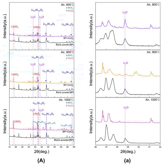 Magnified views of the 2θ range of 36–42° for samples in (A) are shown in Figure 3a. The Li2O peak intensity remained nearly unchanged at 800 °C, decreased at 900 °C, and showed a more pronounced reduction at 1000 °C, confirming that lithium evaporation was enhanced with increasing temperature. In addition, the disappearance of the carbon peak after roasting indicated that carbon was removed by volatilization through oxidation. Valuable metals such as Mn and Co were observed as oxides, which is favorable for subsequent leaching.