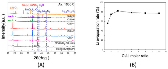(A) XRD patterns of black powder samples after chlorination roasting in air at 1000 °C for 5 h with different Cl/Li molar ratios ranging from 0.5 to 8. (B) Lithium evaporation rate of black powder samples after chlorination roasting in air at 1000 °C for 5 h with different Cl/Li molar ratios ranging from 0.5 to 8, as calculated from the ICP-OES results (within ±1% deviation).