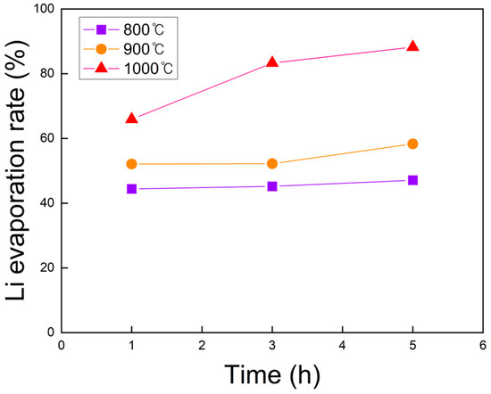 The lithium content before and after roasting was measured by ICP-OES, and the calculated evaporation rates are shown in Figure 11. At all temperatures, the evaporation rate increased with longer roasting times, although the effect was minor at 800 and 900 °C. At 1000 °C, however, roasting time had a pronounced influence, with higher temperatures consistently promoting greater lithium evaporation. The maximum lithium evaporation rate of 66.9% was achieved at 1000 °C for 5 h, identifying this condition as optimal for lithium evaporation during chlorination roasting in N2.
