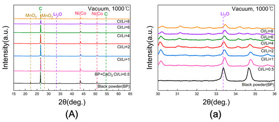 (A) XRD patterns of black powder samples after chlorination roasting in vacuum at 1000 °C for 5 h with different Cl/Li molar ratios ranging from 0.5 to 8 ((a) represents the 30–36° range of 2θ for (A)).