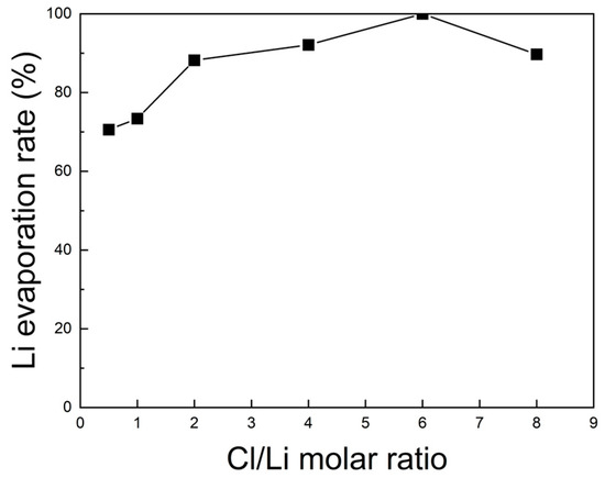 For quantitative verification, the lithium content before and after roasting was analyzed by ICP-OES, and the corresponding evaporation rates are shown in Figure 9. The Li evaporation rate increased steadily with rising Cl/Li ratio from 0.5 to 6, achieving a maximum of 100% at a ratio of 6. Beyond this point, the evaporation rate declined slightly. Therefore, under vacuum at 1000 °C for 5 h, the optimal Cl/Li molar ratio for lithium evaporation was determined to be 6.