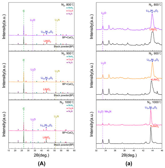 Figure 10 presents the XRD patterns of black powder subjected to conventional roasting and chlorination roasting with CaCl2 at 800, 900, and 1000 °C for 5 h in N2. Magnified views of the 2θ range between 32° and 46° for samples in (A) are shown in Figure 10a. At 800 and 900 °C, the Li2O peak intensity remained largely unchanged after CaCl2 addition, whereas at 1000 °C the Li2O peak decreased, indicating lithium loss. However, this peak overlapped with Mn4N, making precise quantification difficult. Across all temperatures, LiNiO2 peaks were observed in the samples roasted without CaCl2, while the samples roasted with CaCl2 exhibited Li0.4Ni1.6O2 formation. This transformation suggests that LiCl was generated and subsequently evaporated during chlorination roasting. The presence of Li3N peaks further indicated that lithium oxides reacted with nitrogen to form lithium nitride. Residual carbon peaks showed that carbon did not volatilize under N2 conditions, remaining in the samples after roasting. In addition, Ni, Co, and Mn were detected as nitride phases (Ni3N, Co2N, MnNₓ), implying that further conversion steps may be required to improve leaching efficiency.