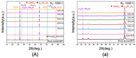 Figure 12A shows the XRD patterns of black powder subjected to chlorination roasting at 1000 °C for 5 h in N2 with Cl/Li molar ratios ranging from 0.5 to 8. A magnified view of the 2θ range between 32° and 46° is presented in Figure 12a. With increasing Cl/Li ratio, the Li2O peak near 33° appeared to gradually decrease; however, overlap with the Mn4N peak made accurate evaluation difficult. Across all conditions, the LiNiO2 peak observed in samples without CaCl2 was transformed into Li0.4Ni1.6O2 after CaCl2 addition, reflecting lithium loss due to evaporation. As the variations in peak intensity with respect to Cl/Li ratio were limited, a quantitative analysis was required to confirm these trends.