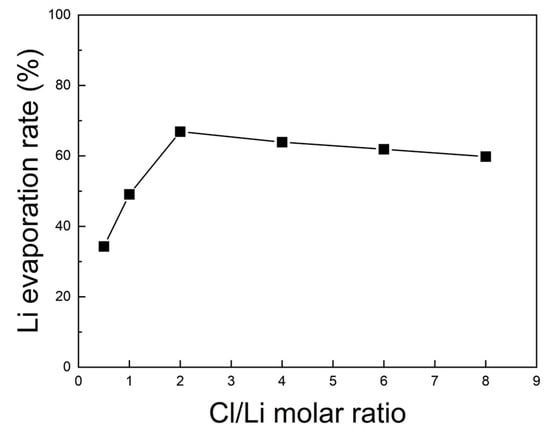 For this purpose, the lithium contents before and after roasting were measured by ICP-OES, and the corresponding evaporation rates are shown in Figure 13. The Li evaporation rate increased steadily as the Cl/Li ratio rose from 0.5 to 2, reaching a maximum of 66.9% at a ratio of 2. Beyond this value, the rate declined slightly. Therefore, under N2 at 1000 °C for 5 h, the optimal Cl/Li molar ratio for lithium evaporation in the chlorination roasting process was determined to be 2.