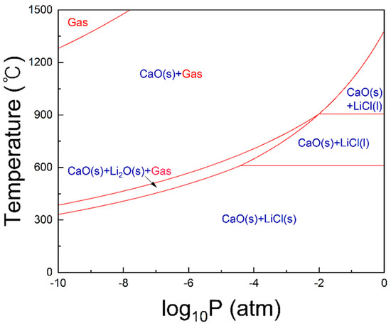 To further support this mechanism, a thermodynamic analysis was performed using FactSage to evaluate the Li2O–CaCl2 system. The pressure–temperature phase diagram (Figure 14) confirmed that gas-phase product formation increased as pressure decreased. This trend can be attributed to the higher vapor pressure of volatile lithium compounds such as LiCl at reduced pressures, which lowers their evaporation temperature and enables gas-phase formation even at relatively low temperatures. Consequently, vacuum conditions are expected to maximize lithium evaporation efficiency.