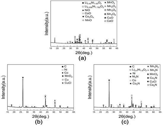 For the sample roasted in air, nickel was present mainly as NiO, cobalt as CoO and Co3O4, manganese as MnO, MnO2, Mn2O3, Mn3O4, and Mn5O8, and copper as CuO. Importantly, these transition metals remained in the form of stable oxides that are not susceptible to chlorination under the applied conditions, whereas lithium existed as Li2O and readily reacted with CaCl2 to form volatile LiCl. This phase stability difference justifies the selectivity of lithium extraction and further validates the effectiveness of CaCl2 as a chlorinating agent. Lithium-containing NCM oxides were also identified, together with CaO generated from the reaction between CaCl2 and oxygen. In the vacuum-roasted sample, residual carbon was detected, and Ni, Co, and Cu were reduced to metallic states due to carbothermal reduction, while Mn remained as MnO2, and copper also appeared as CuCl. In the N2-roasted sample, nitride phases were additionally observed, including Ni3N, Co2N, Mn3N2, Mn4N, and Cu3N, along with metallic phases and Ca2N formed from CaCl2–N2 reactions. MnCl2 and CuCl were also detected.