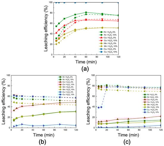 Figure 19 presents the leaching behavior of Ni, Co, Mn, and Cu from black powder subjected to chlorination roasting in (a) air, (b) vacuum, and (c) N2 conditions. The experiments were conducted under fixed conditions of 300 rpm stirring speed, a solid-to-liquid ratio of 50 g/L, a temperature of 80 °C, and 3 M H2SO4, with reaction times of 0–120 min. To evaluate the influence of oxidizing agents, the results obtained without H2O2 were compared with those after the addition of 10% H2O2.