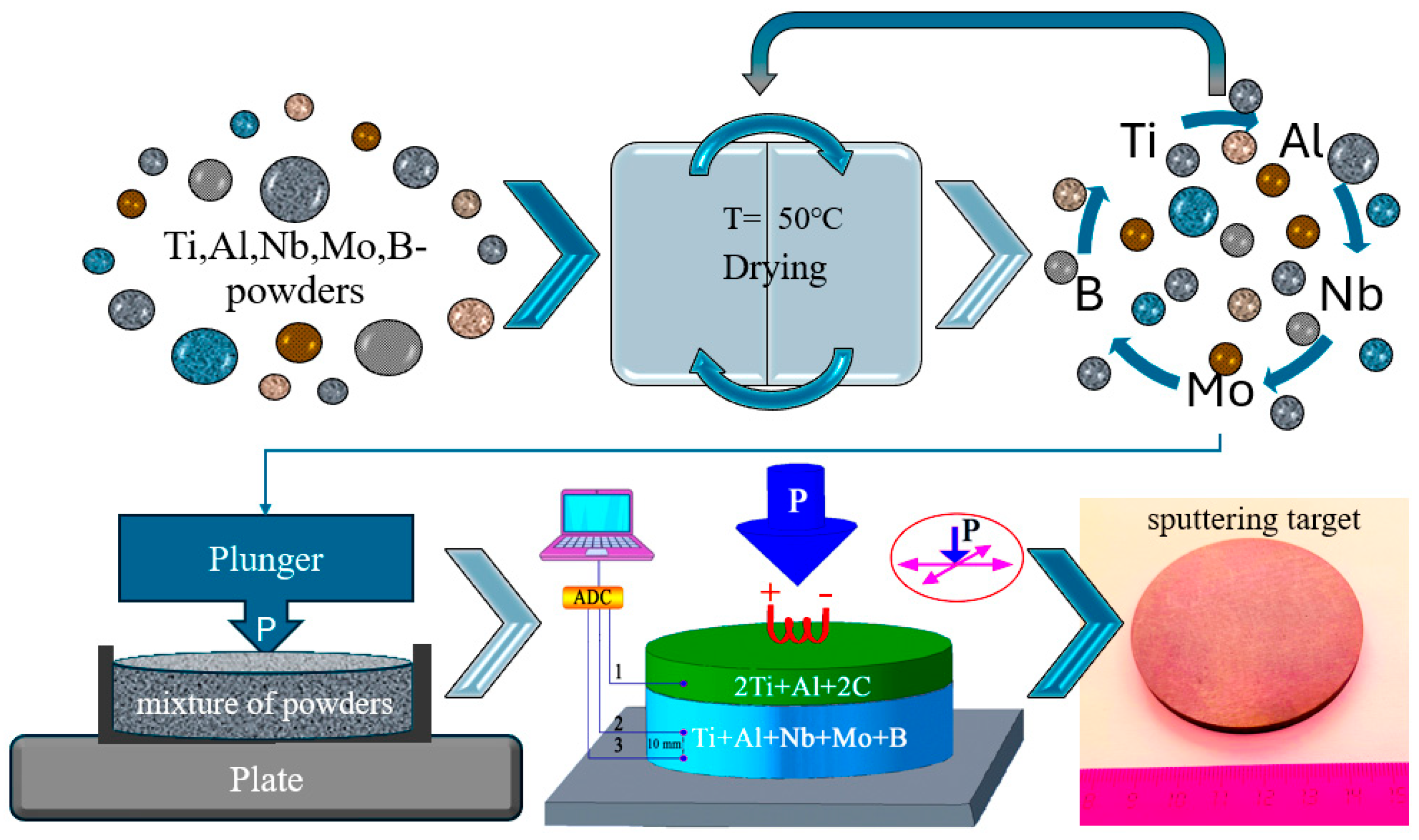- The authors first demonstrated the feasibility of synthesizing multicomponent materials based on the Ti-Al-(Nb,Mo) system under conditions that combine combustion processes and high-temperature shear deformation. The results of the measured physico-mechanical properties of the obtained materials indicate their promising potential for use both as structural and functional components, e.g., as targets for depositing protective coatings via PVD methods.