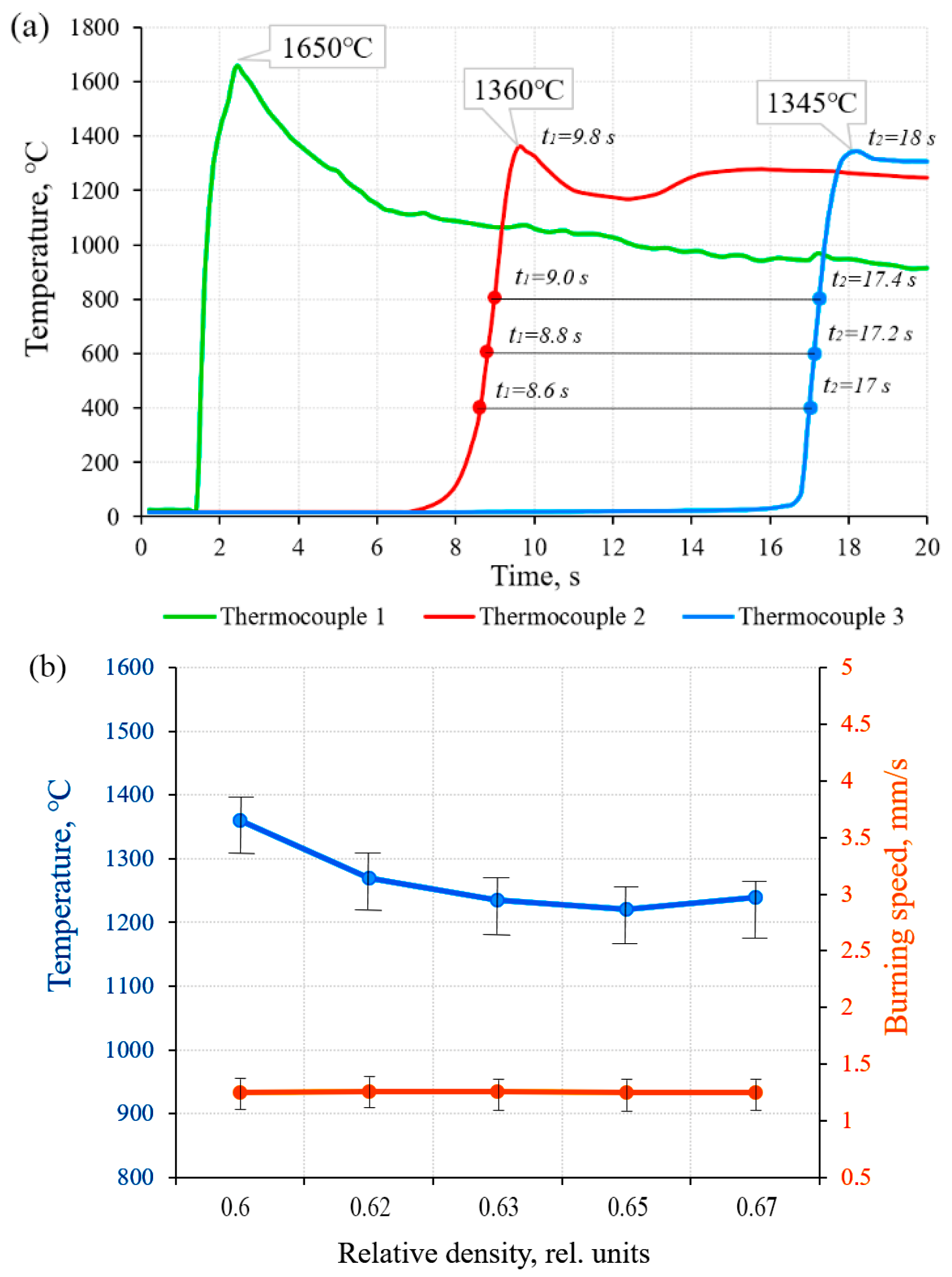 - Optimal synthesis parameters for initiating combustion and achieving maximum performance for the 51.85Ti–43Al–4Nb–1Mo–0.15B (wt%) composition were established. These include fabricating powder compacts with a relative density of 0.42 and employing a highly exothermic 3Ti-Al-2C (molar ratio) chemical furnace. This configuration ensures a maximum combustion initiation temperature of 1650 °C, which is critical for sustaining the reaction in this low-exothermicity system.