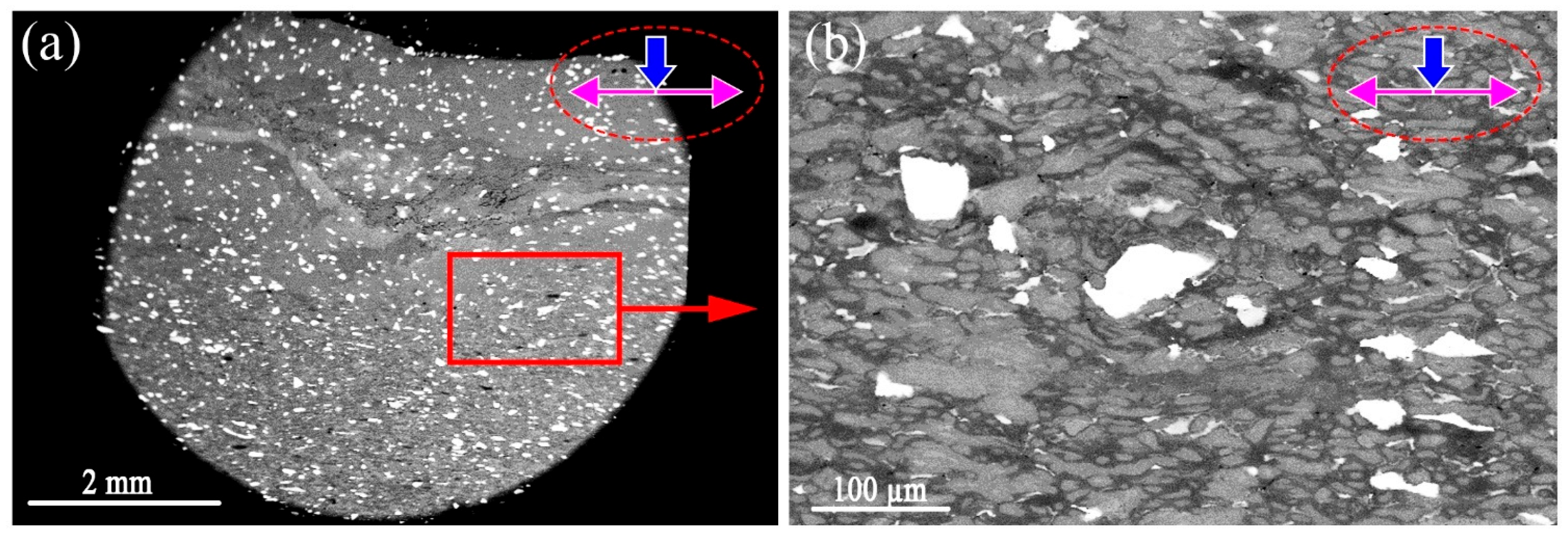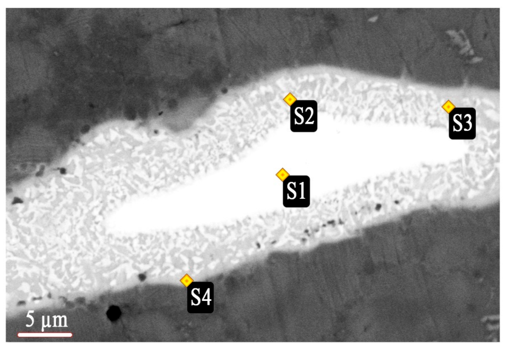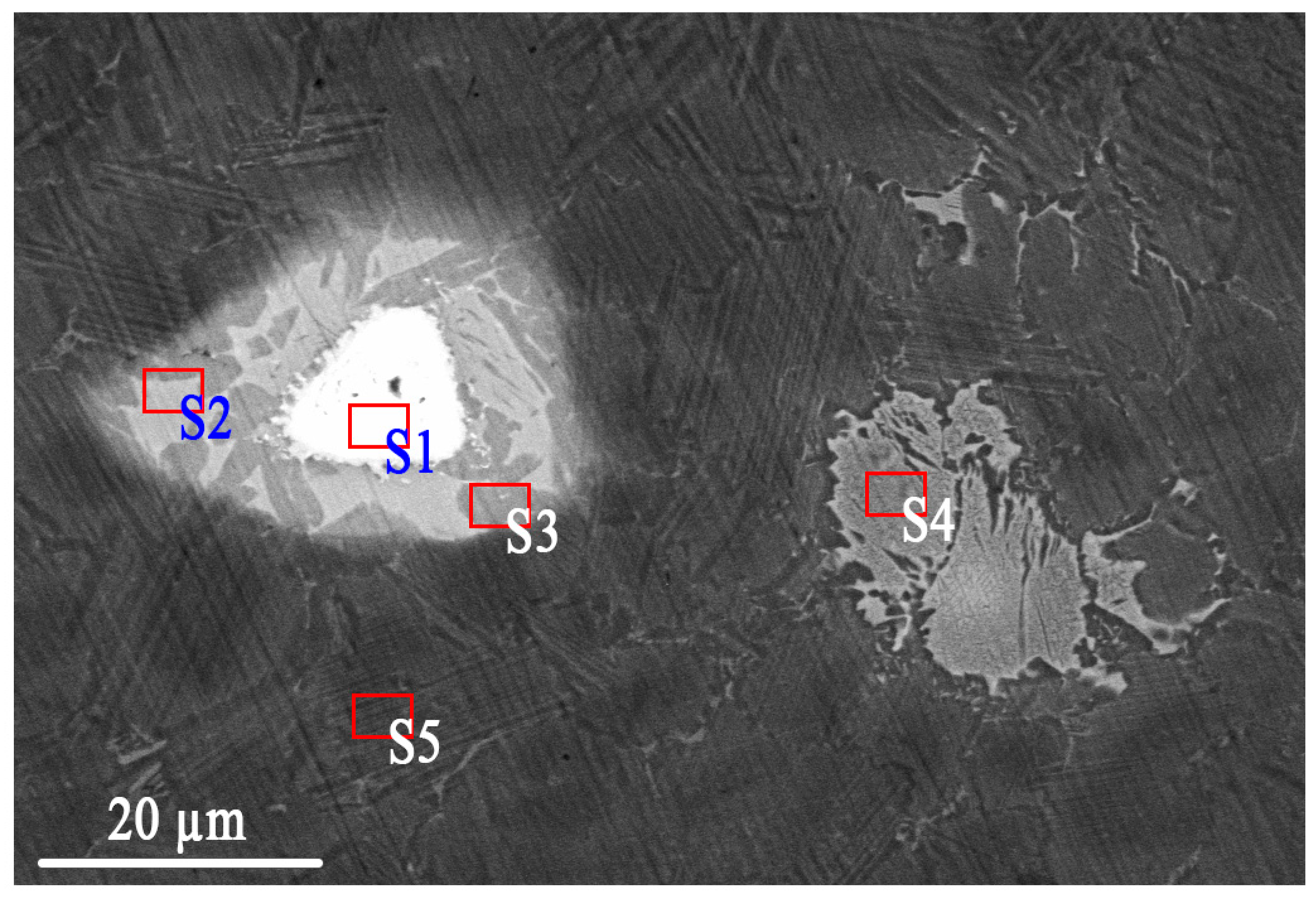 - Isothermal annealing at 1000 °C for 3 h promotes significant phase evolution, resulting in an increased volume fraction of the (Al0.86Nb0.14)(Ti2.85Nb0.15) ternary solid solution and the formation of the Nb2Al intermetallic phase. This phase transformation confirms a solid-state diffusion mechanism as the primary driver for the formation of these compounds during the annealing process.
