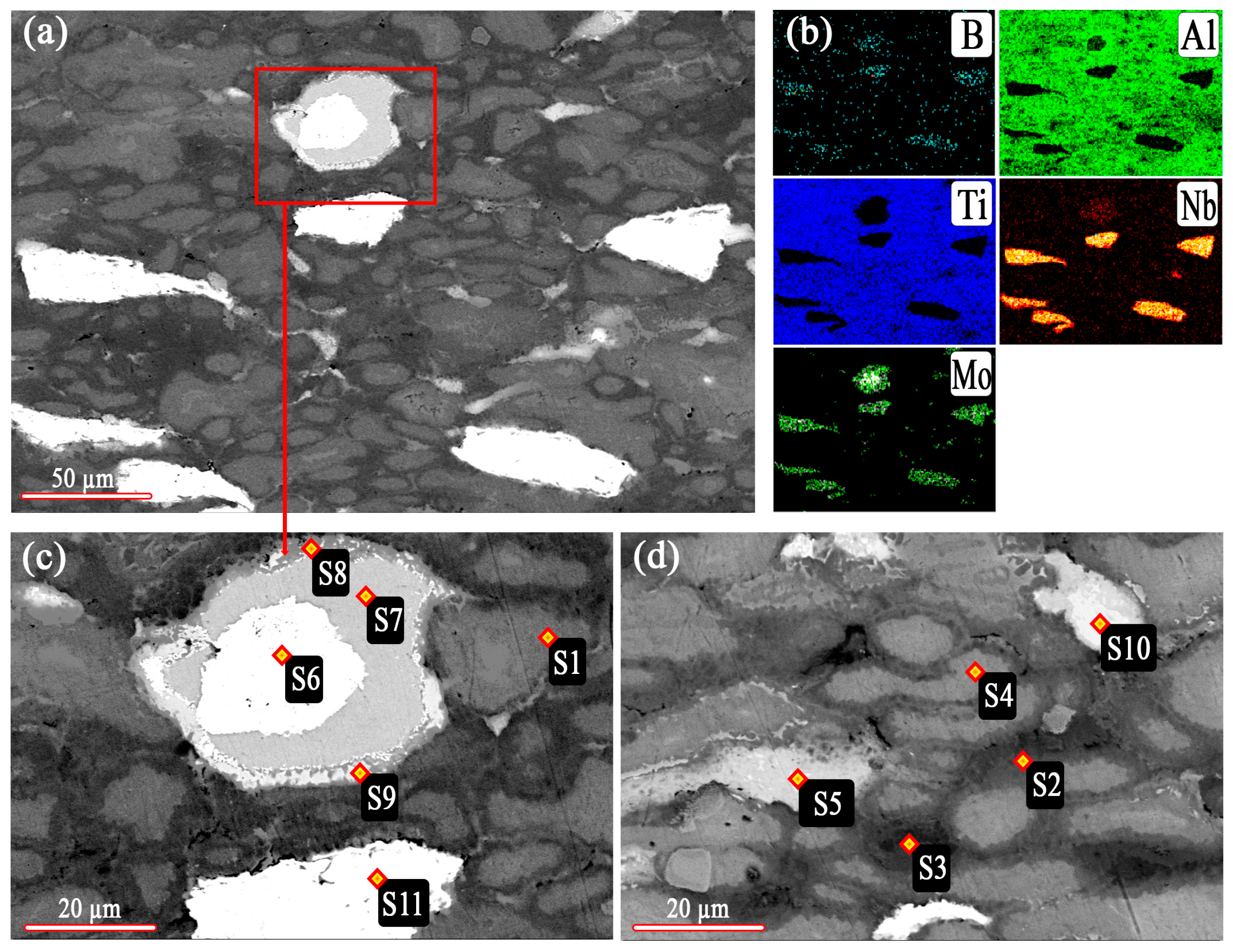- Tan, Y.; Chen, R.; Fang, H.; Liu, Y.; Cui, H.; Su, Y.; Guo, J.; Fu, H. Enhanced Strength and Ductility in Ti46Al4Nb1Mo Alloys via Boron Addition. J. Mater. Sci. Technol. 2021, 102, 16–23. [Google Scholar] [CrossRef]