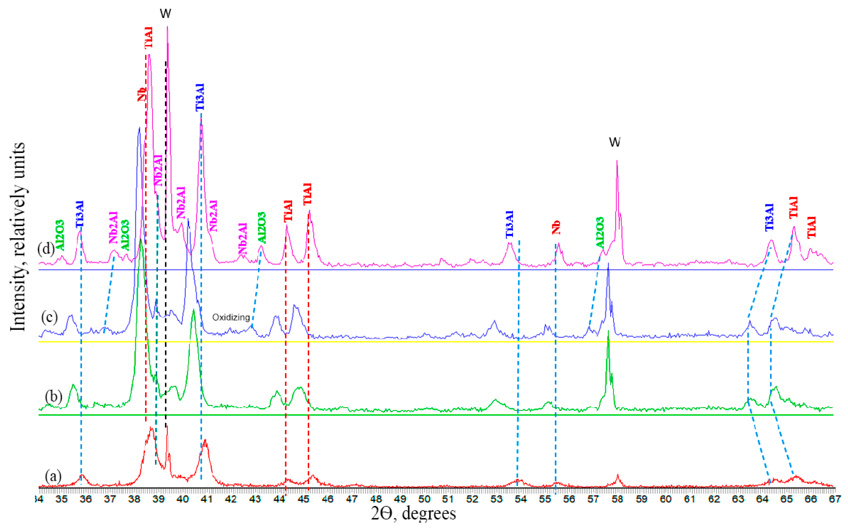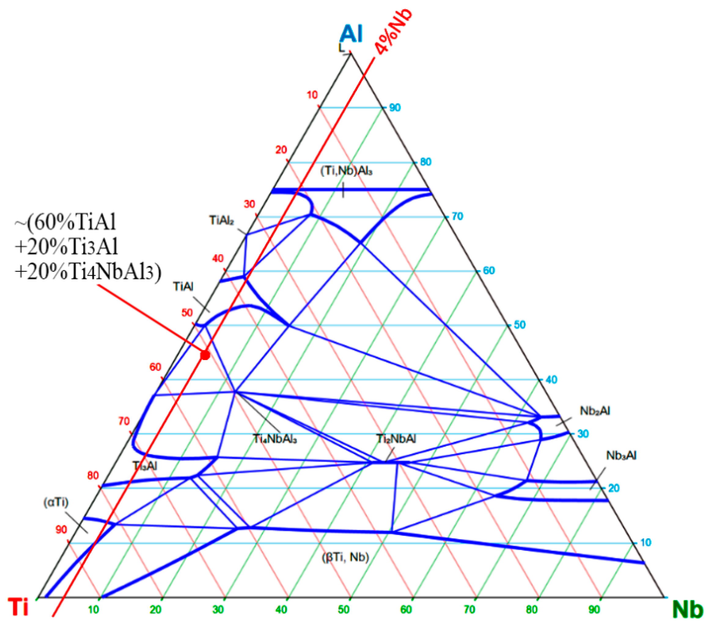 - Fang, H.; Chen, R.; Liu, Y.; Tan, Y.; Su, Y.; Ding, H.; Guo, J. Effects of Niobium on Phase Composition and Improving Mechanical Properties in TiAl Alloy Reinforced by Ti2AlC. Intermetallics 2019, 115, 106630. [Google Scholar] [CrossRef]