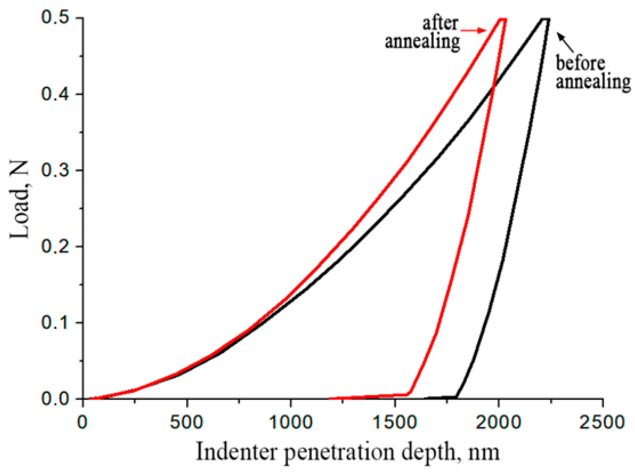 - The phase and structural changes induced by isothermal annealing directly lead to an enhancement of mechanical properties: (i) microhardness and elastic recovery increased by a factor of 1.2, and (ii) Young’s modulus exhibited a modest increase of ~10 GPa. The maximum values achieved for the annealed material were: 7.4 GPa (microhardness), 31.8% (elastic recovery), and 200 GPa (Young’s modulus). This improvement is attributed to the formation of a harder and more stable phase assemblage.