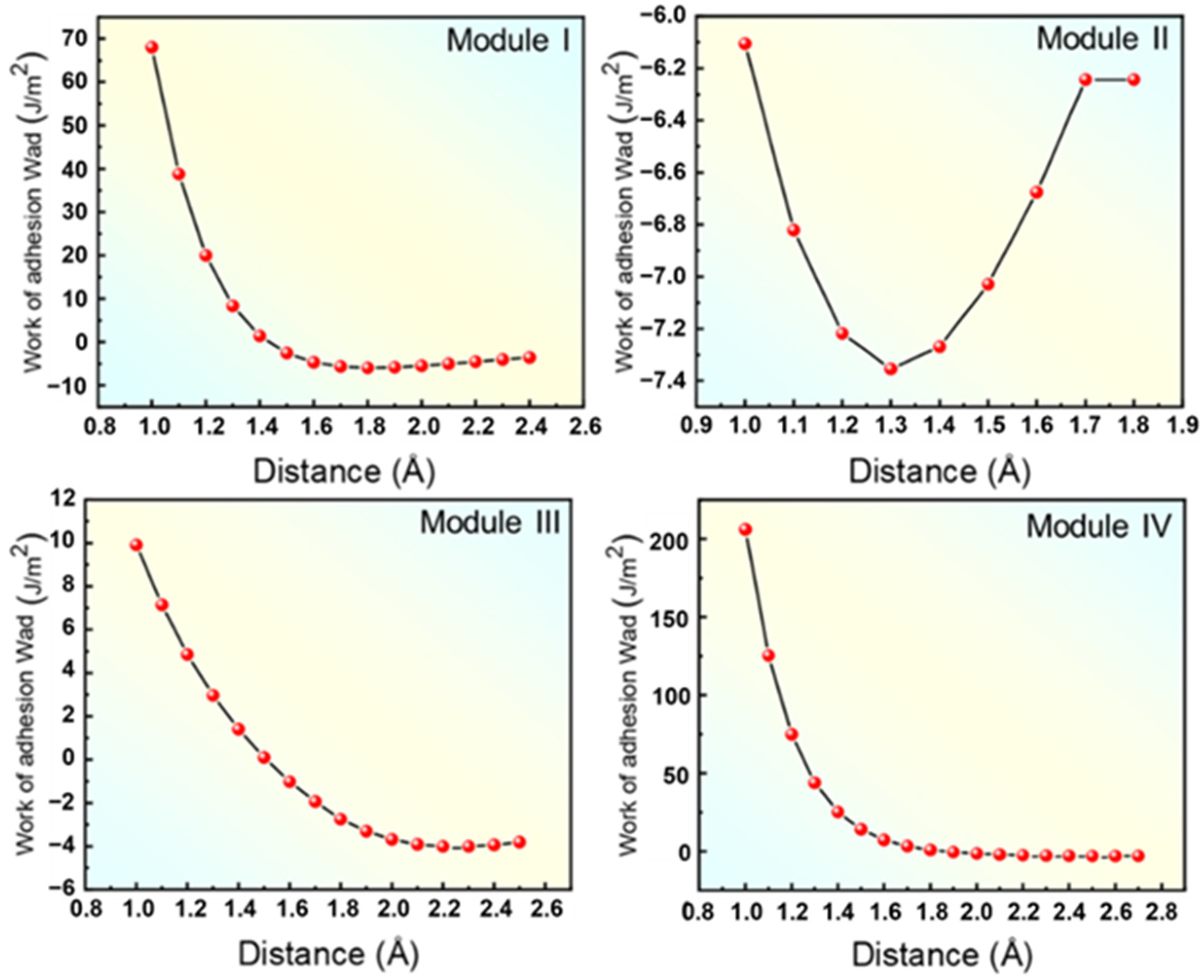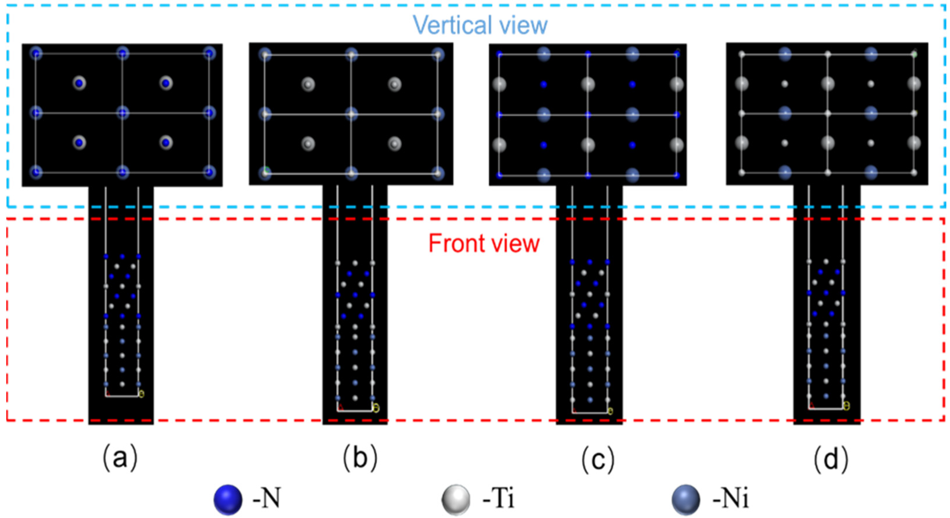 - Four kinds of interface models between (110)NiTi and (200)TiN with different atomic layer arrangements were constructed. In addition, all four interface models had a positive work of adhesion (Wad), indicating stable interface bonds between (110)NiTi and (200)TiN. In contrast, Model III had the highest Wad of 9.773 J/m2, attributed to the strong N-Ti bonds formed at the interface after relaxation.