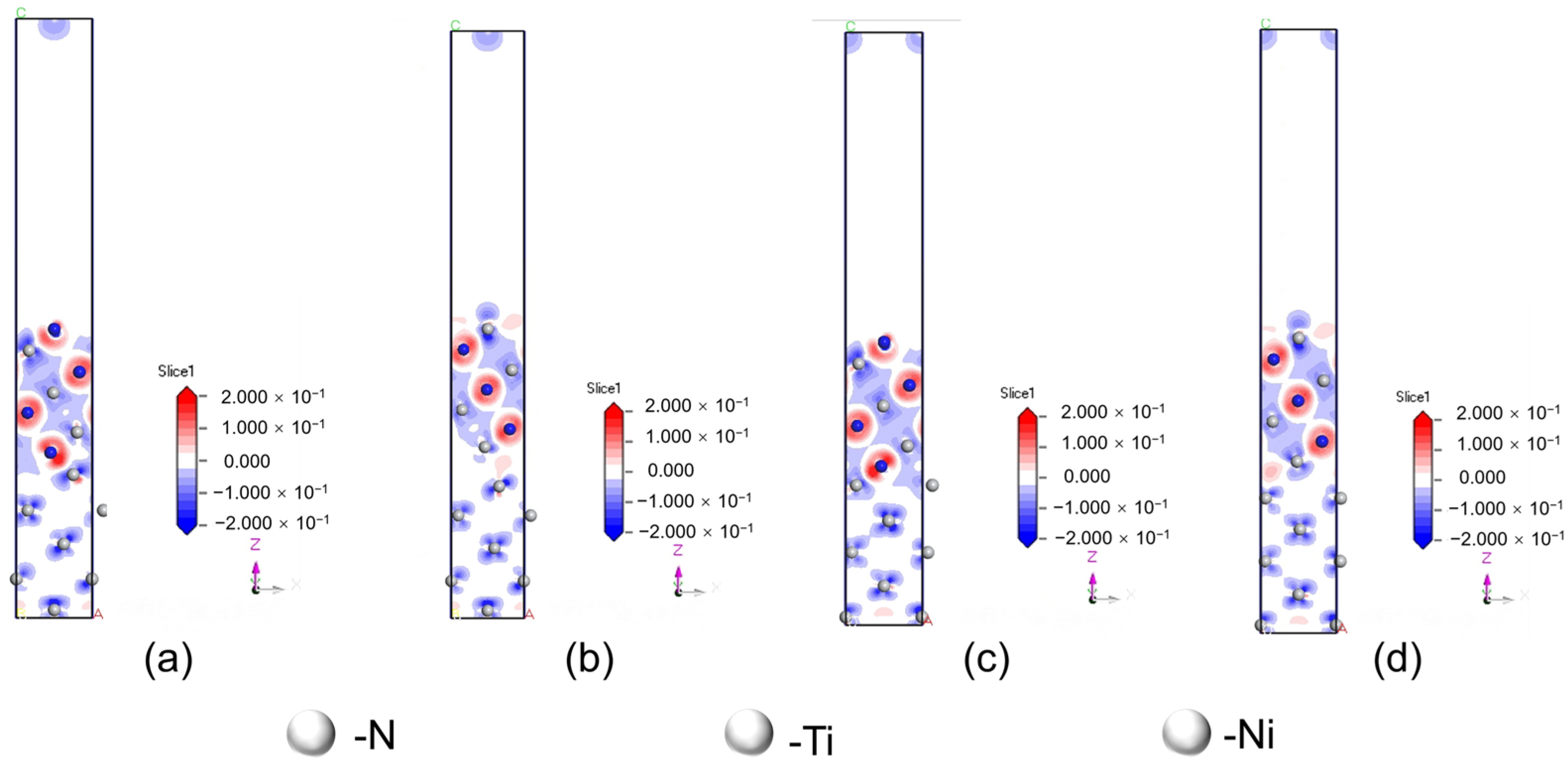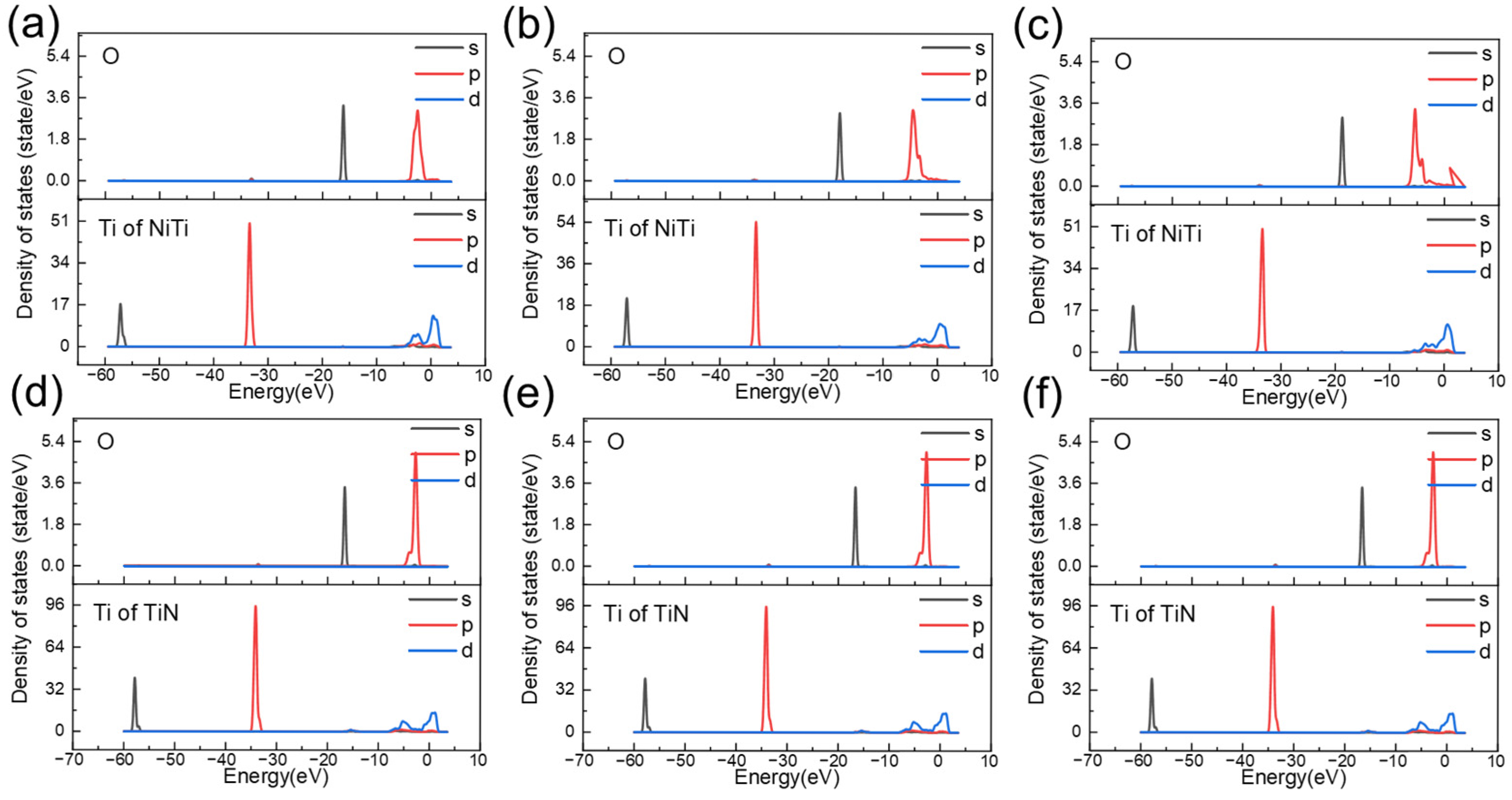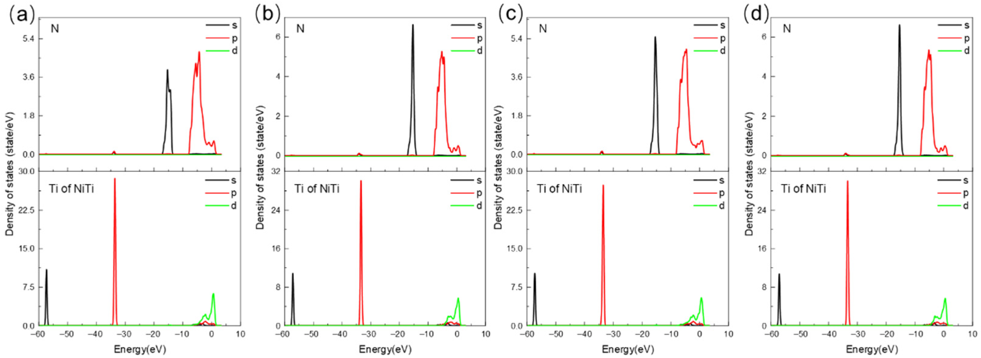 - A significant negative density difference around Ti atoms and a significant positive density difference around N atoms were observed at the interface between (110)NiTi and (200)TiN, indicating strong interface bonding stability between (110)NiTi and (200)TiN. The Ti-d orbitals of (110)NiTi and the N-p orbitals of (200)TiN overlapped at approximately −3 eV, indicating orbital hybridization and bonding formation of Ti-N.