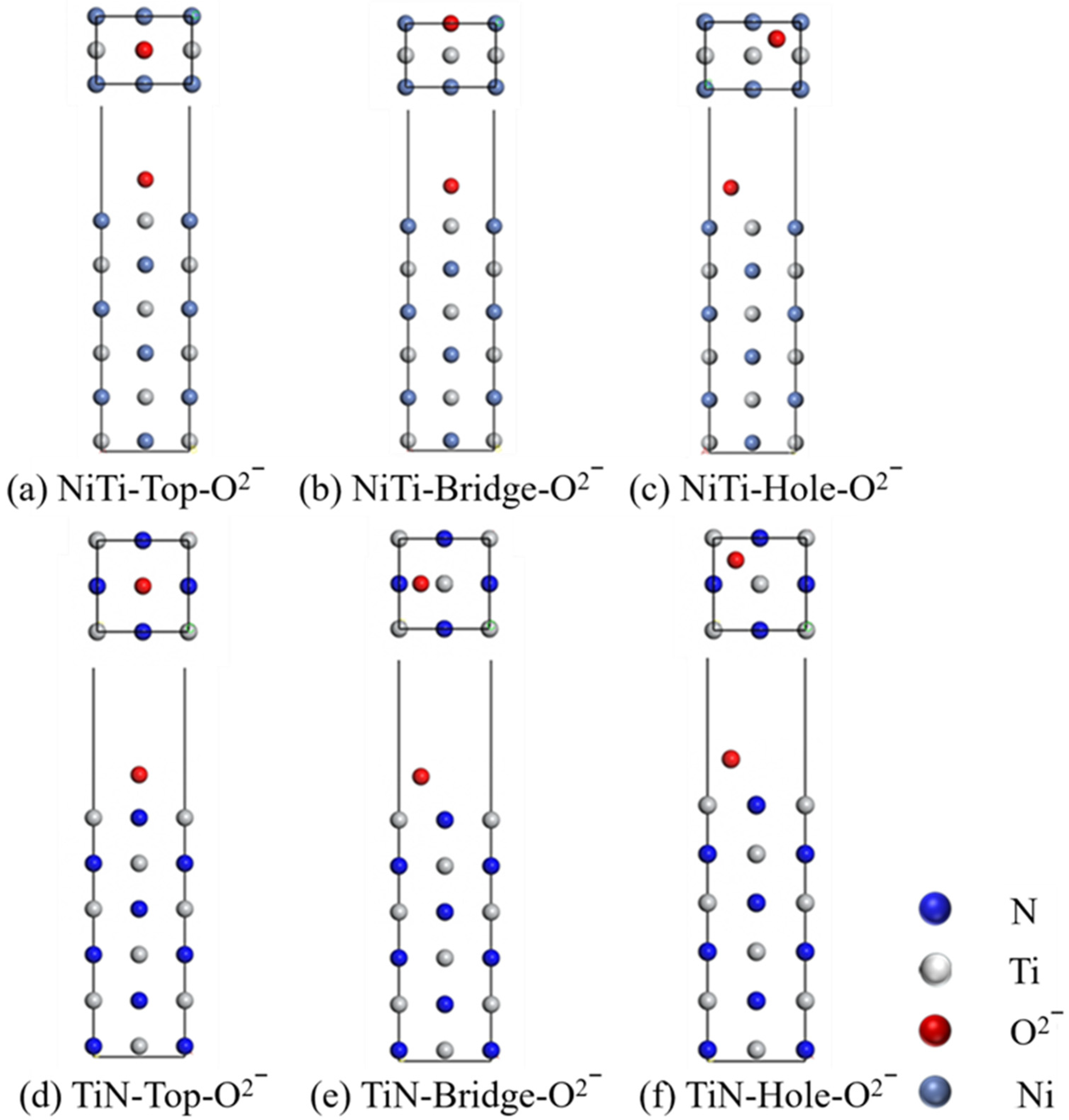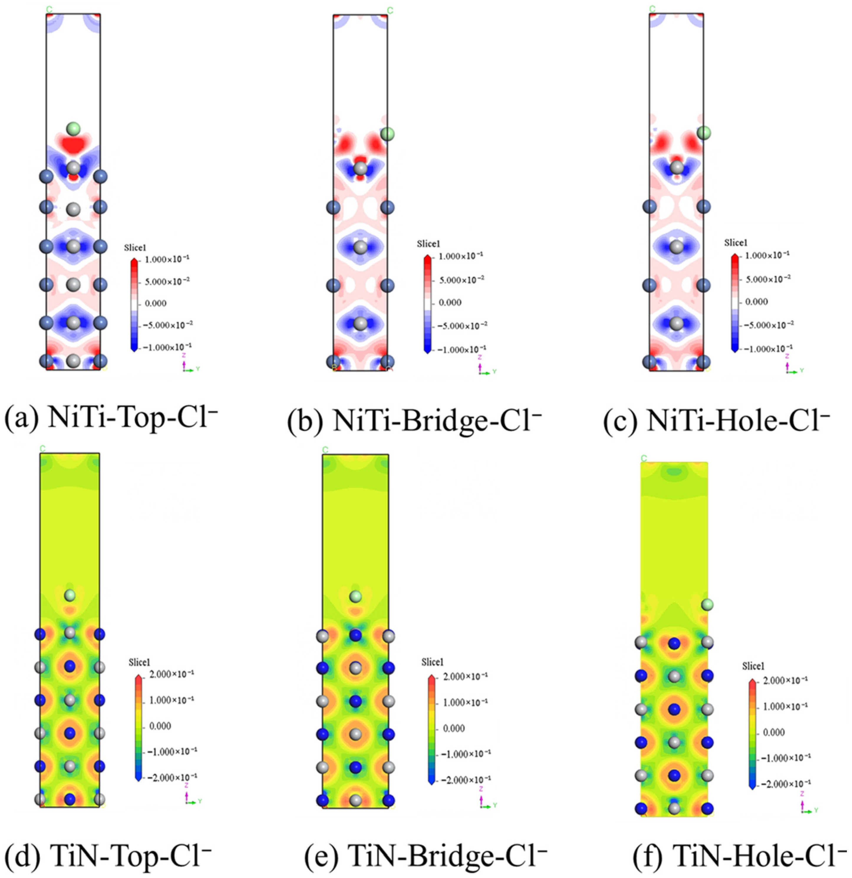 - The adsorption capacities of Cl− on the surface of (110)NiTi and (200)TiN were investigated. The adsorption energies of Cl− on the surface of (110)NiTi are lower than that of (200)TiN, regardless of the Cl− adsorption sites. This suggested that (110)NiTi was more prone to reacting and forming bonds with Cl−, indicating a higher thermodynamic driving force for corrosion initiation. Therefore, the introduction of a TiN layer on the surface of NiTi alloy can effectively enhance its corrosion resistance properties by acting as a more inert barrier layer.