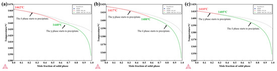 Scheil–Gulliver solidification paths: (a) 304; (b) 310S; (c) 310Al (calculated using Thermo-Calc software).