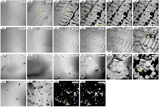 The solidification process of the experimental steels: (a1–a6) 304; (b1–b6) 310S; (c1–c6) 310Al; (d1–d4) 310Al-H.