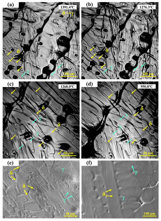 S.H. Kim et al. [24] reported that during the initial stage of δ-ferrite dissolution, over 50% of δ-ferrite transforms rapidly, particularly at high temperatures where interface migration is fast. This rapid dissolution is mainly attributed to the excessive consumption of Cr within the δ-ferrite. The dissolution kinetics of δ-ferrite are controlled by the diffusion of Cr and Ni in the austenite phase [25]. As the temperature decreases, the δ-ferrite gradually transforms into γ, with the phase boundary continuing to migrate toward the δ-ferrite. As shown in Figure 3c,d, the ferrite fraction further decreases. When the temperature drops to 950.8 °C, parallel lath-like structures are observed to precipitate within the ferrite.