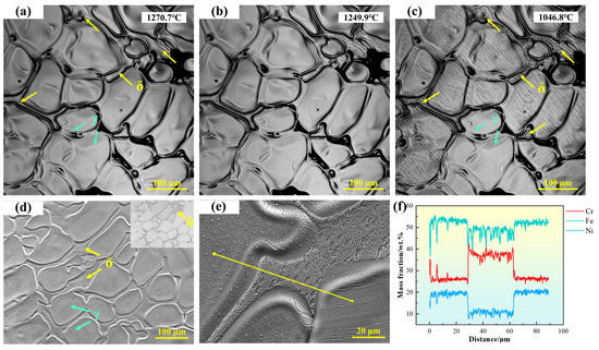 (a–c) In situ observation of solid-state transformation in 310S stainless steel; (d) SEM microstructure of 310S stainless steel; (e,f) EDS line scan analysis of 310S stainless steel. (The yellow arrow in the figure indicates the position of the EDS line scan analysis).