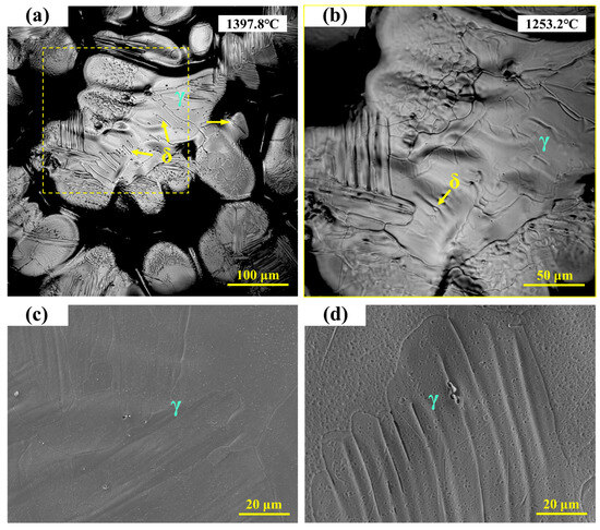 As shown in Figure 5a, the microstructure of 310Al stainless steel consists of austenite and a small amount of granular ferrite precipitated on the matrix, with ferrite particles significantly smaller than those in 310S stainless steel. Figure 5b presents a locally enlarged view, showing that as the temperature decreases from 1397.8 °C to 1253.2 °C, the fine ferrite particles gradually transform into austenite, leaving only a very small amount of residual ferrite. The high-temperature in situ confocal microscopy micrographs of 310Al stainless steel are shown in Figure 5c,d, revealing a typical austenite dendritic microstructure. In the imaged area, δ-ferrite almost completely transforms into austenite during cooling, leaving fine depressions in the interdendritic regions after transformation.