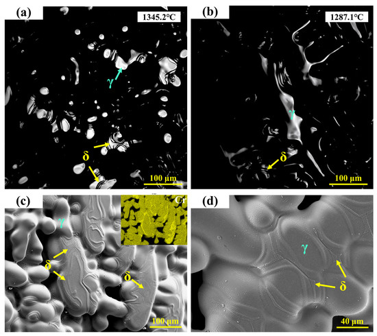 Figure 6a,b show the in situ observations of the solid-state phase transformation in 310Al-H stainless steel. It can be seen that the ferrite formed at the final stage of solidification gradually transforms into austenite during cooling. The high-temperature in situ confocal microscopy micrographs of the 310Al-H sample are shown in Figure 6c,d, revealing a microstructure primarily composed of austenite dendrites, with a small amount of residual ferrite still visible in the interdendritic regions. The EDS area scan shown in the upper right corner of Figure 6c further confirms that these ferrite regions are enriched in Cr.