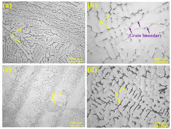 The microstructure of 304 stainless steel observed under high-temperature in situ confocal microscopy is shown in Figure 3e. Irregular δ-ferrite is distributed in the interdendritic regions, slightly recessed from the surface, corresponding to the ferrite structures observed in Figure 3d. In the final room-temperature microstructure, both the austenite matrix and a small amount of residual δ-ferrite are retained. As shown in Figure 3f, some δ-ferrite remains as lath-like structures in the interdendritic regions, while other δ-ferrite completely transforms into austenite during cooling, leaving fine depressions in the interdendritic areas after transformation.