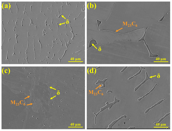 The SEM microstructures of the samples observed after high-temperature in situ confocal microscopy are shown in Figure 8. In 304 stainless steel (Figure 8a), ferrite is distributed in a lath-like morphology, and no carbide precipitation is observed. In 310S stainless steel (Figure 8b), ferrite is irregularly distributed along the grain boundaries, with discontinuous M23C6 precipitates present at the boundaries. The higher Cr content promotes the formation of M23C6 in 310S stainless steel. In the 310Al sample (Figure 8c), the ferrite size is significantly reduced, appearing as either spherical or fine elongated particles. M23C6 is also present along grain boundaries, but both its size and quantity are lower than in 310S stainless steel. This is because the γ/δ interface is a favorable site for M23C6 precipitation, and as the δ-ferrite content decreases, the γ/δ interface is reduced, thereby limiting M23C6 formation. In the 310Al-H sample (Figure 8d), ferrite exhibits a parallel arrangement with significantly increased size, and M23C6 is mainly distributed along the γ/δ interfaces.