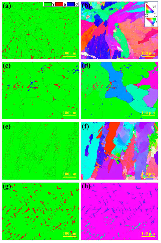 To further investigate the microstructural characteristics of the HT-CLSM samples, EBSD analysis was performed, as shown in Figure 9. Figure 9a,c,e,g display the phase distribution of the experimental steels (austenite in green, ferrite in red, and σ phase in blue), while Figure 9b,d,f,h show the corresponding inverse pole figure (IPF) maps. The results indicate significant differences in phase distribution among the experimental steels. In 304 stainless steel, ferrite content is the highest, primarily appearing as small blocky and short lath-like structures, consistent with its FA solidification mode. In 310S stainless steel, ferrite is mainly distributed along austenite grain boundaries and grows continuously along them, with the σ phase precipitating nearby. In contrast, ferrite in 310Al stainless steel is mainly short laths, with significantly reduced content, and the austenite grains are refined. No σ phase precipitation is observed, indicating that Al suppresses σ phase formation. In the 310Al-H sample, ferrite exhibits irregular blocky morphology and grows along the thermal gradient direction, forming a dendritic structure as shown in Figure 9g, with ferrite content significantly higher than in 310Al. Moreover, the high cooling rate promotes the preferential growth of columnar grains, reducing the total number of grains.