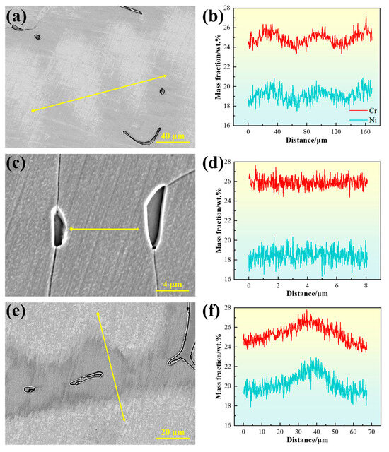 The compositional inhomogeneity caused by dendritic segregation leads to microstructural differences, which can significantly affect material properties [26]. Figure 10 presents the line scan results of the experimental steels. In the 310S sample, Cr and Ni exhibit pronounced fluctuations, with relative enrichment in the interdendritic regions, indicating positive segregation. This occurs because the dendrite cores form first from the liquid during solidification, with compositions close to the initial alloy average, while elements with partition coefficients less than 1 gradually enrich in the residual liquid, eventually leading to segregation in the interdendritic regions. For steels solidifying in the austenite mode, segregation has a more pronounced effect on material properties because alloying elements that segregate to grain boundaries cannot be readily redistributed during subsequent solid-state transformations, thus being retained in the solidified microstructure.