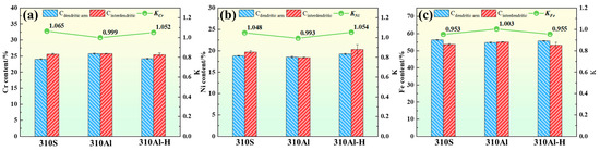 Here, represents the average elemental concentration in the interdendritic regions, and represents the average concentration in the dendrite arm regions. The ratio of these two values is used to quantify the degree of microsegregation in the solidified microstructure. The results are shown in Figure 11. In 310S stainless steel, the degree of elemental segregation follows the order Cr > Ni > Fe. Both Cr and Ni exhibit positive segregation, with segregation ratios of 1.065 and 1.048, respectively, while Fe exhibits negative segregation.