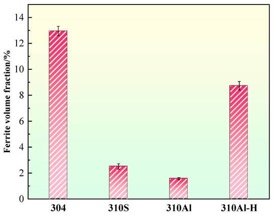 The ferrite content of the samples is summarized in Figure 12. 304 stainless steel exhibits the highest ferrite content, reaching 13.0%, which is consistent with its FA solidification mode, where ferrite forms preferentially during solidification and partially remains. With increasing Al content, the ferrite content in the 310Al sample decreases, as Al reduces solute segregation and thereby suppresses δ-ferrite formation. In contrast, the ferrite content in the 310Al-H sample significantly increases under higher cooling rates. Rapid cooling limits the diffusion of solute elements according to thermodynamic equilibrium, exacerbating segregation and promoting δ-ferrite formation. Moreover, the faster cooling rate suppresses the subsequent δ → γ solid-state transformation, resulting in more δ-ferrite being retained in the final microstructure, often with a coarser morphology. By comparison, samples cooled at lower rates complete the solid-state transformation at higher temperatures, facilitating δ-ferrite dissolution and yielding a lower final ferrite content. Overall, the final ferrite content is governed by the combined effects of solidification mode, alloy composition, and cooling rate [32]. It is noteworthy that previous studies have shown that higher δ-ferrite content can significantly increase the intergranular corrosion susceptibility of austenitic stainless steels, posing potential risks to service safety [8,19].
