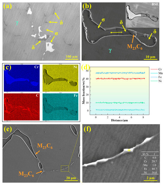 In addition to the σ phase, M23C6 carbides also precipitate in 310S stainless steel. As shown in Figure 13e,f, M23C6 is primarily distributed discontinuously along grain boundaries or precipitates at the γ/δ phase interfaces. Figure 13f presents the chemical composition of this phase, showing that it is enriched in Cr and C compared with the matrix. The precipitation of such carbides not only reduces microstructural stability but may also compromise the corrosion resistance of the grain boundaries.