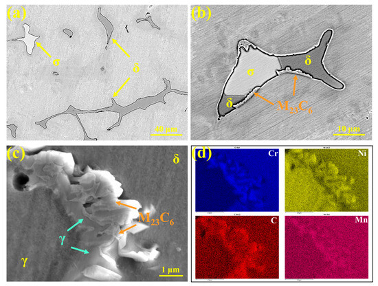 As shown in Figure 14b, a large number of M23C6 carbides are distributed along the phase interfaces. Figure 14c presents the SEM morphology of M23C6 and the corresponding EDS area scan, showing that M23C6 exhibits a typical eutectic-like structure and is primarily enriched at the δ/γ phase interfaces, with Cr and C contents significantly higher than the matrix. This indicates that the precipitation of M23C6 is strongly influenced by the ferrite–austenite interface structure and local elemental segregation. After solidification, the microstructure remains in the high-temperature γ + δ two-phase region, where C and Cr segregate to grain boundaries or interdendritic regions, and dislocations and vacancies at the boundaries also facilitate M23C6 nucleation. As the temperature decreases and the solubility of C and Cr in austenite declines, M23C6 precipitates extensively along the grain boundaries at approximately 900–1100 °C, creating locally Cr-depleted regions and thereby increasing intergranular corrosion susceptibility [38].