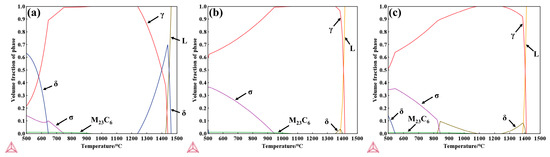 The temperature-dependent stable phase fraction curves: (a) 304 stainless steel; (b) 310S stainless steel; (c) 310Al stainless steel (calculated using Thermo-Calc software).