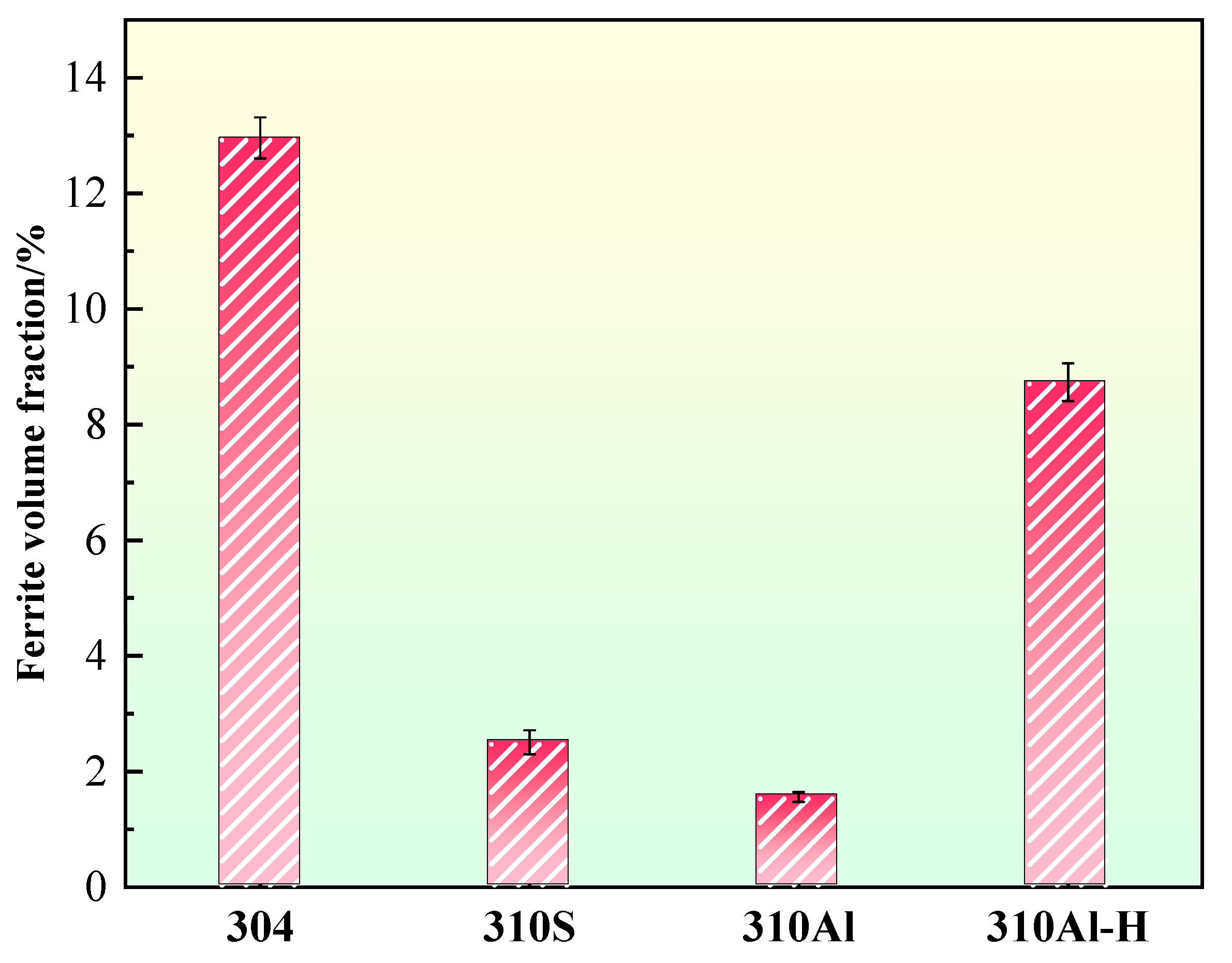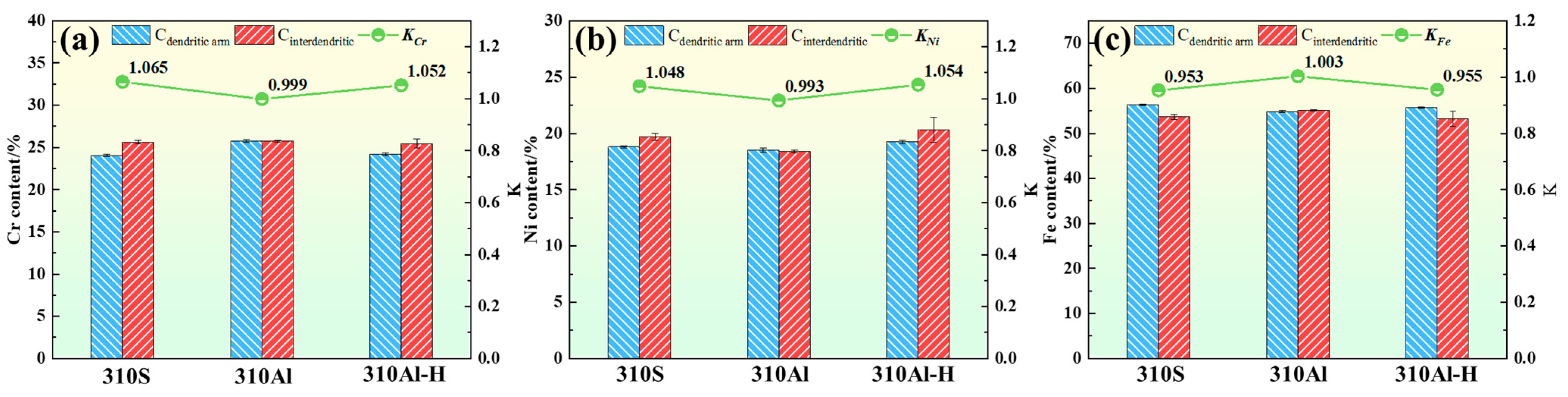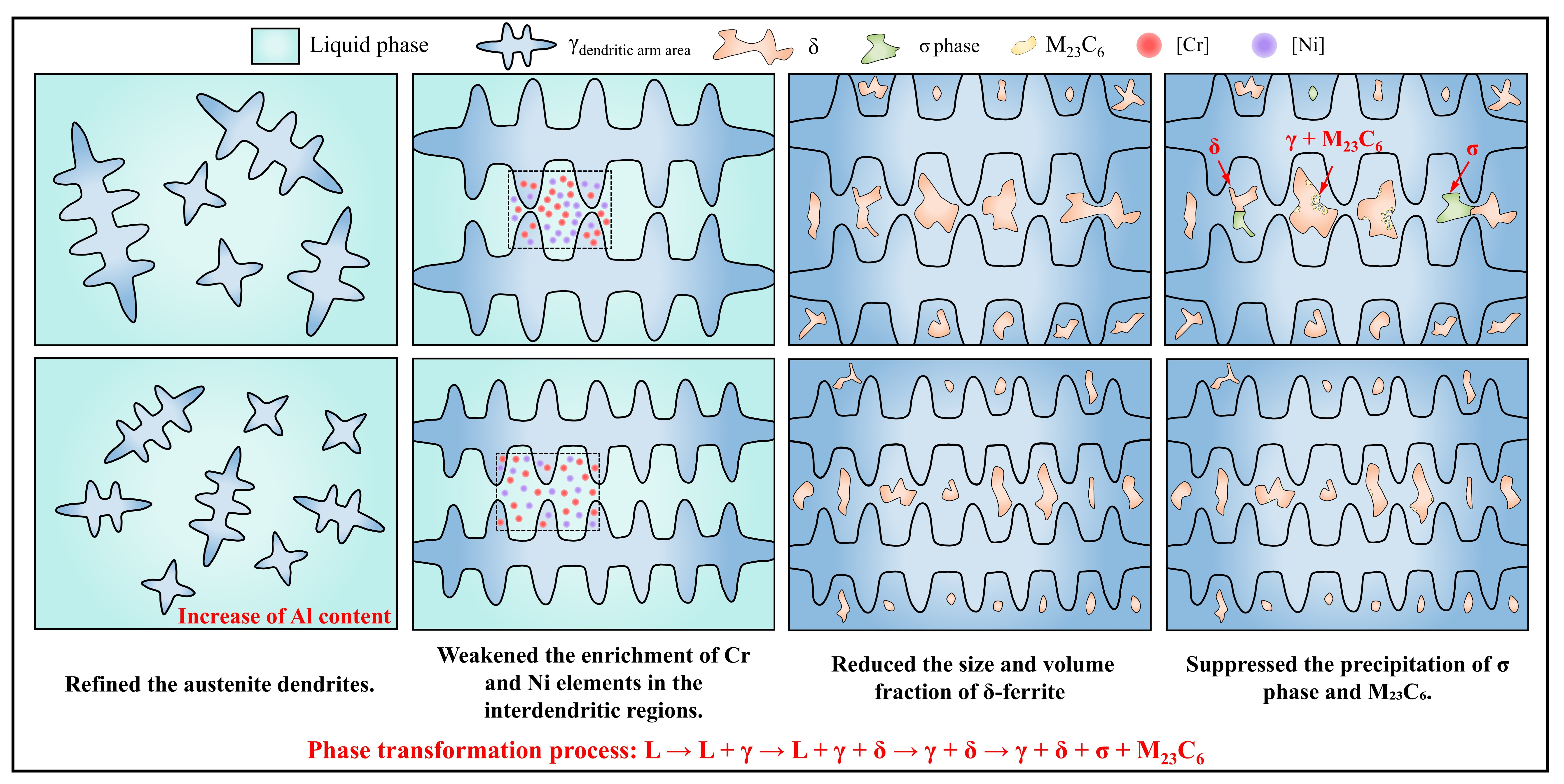 - With increasing Al content, the solidification mode of 310S stainless steel remains unchanged, but its microstructural features are significantly altered. The addition of Al refines the austenite grains and reduces solute enrichment in the interdendritic regions, thereby markedly decreasing elemental segregation. As a result, both the size and fraction of δ-ferrite are reduced, while the precipitation of σ phase is suppressed. The amount of M23C6 carbides decreases because the addition of Al reduces the δ/γ interface area, thereby diminishing the number of preferred nucleation sites for M23C6;
