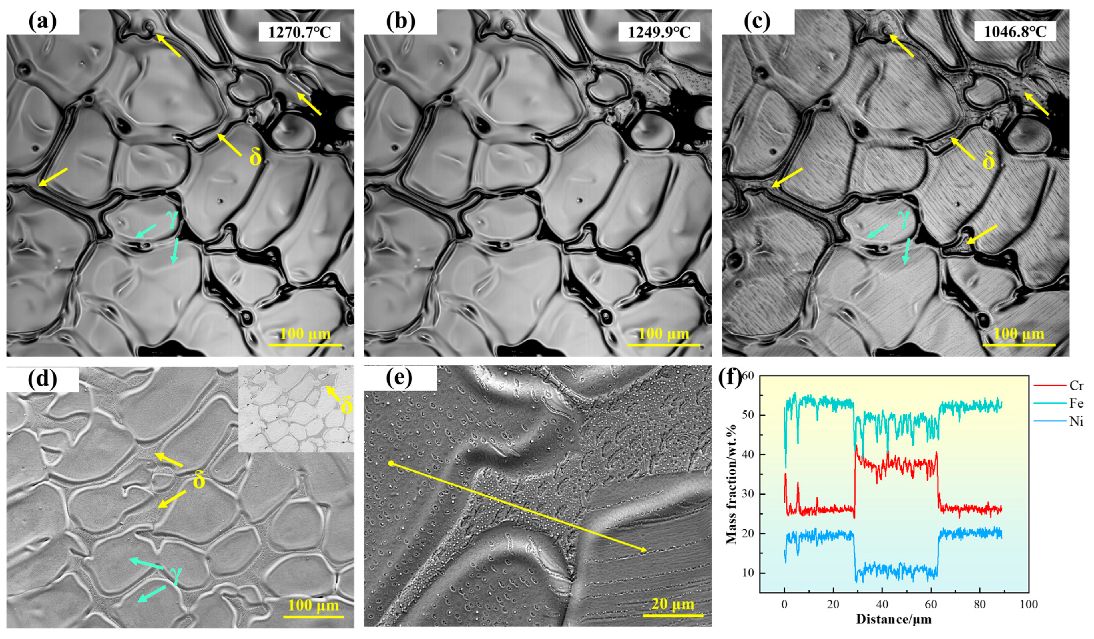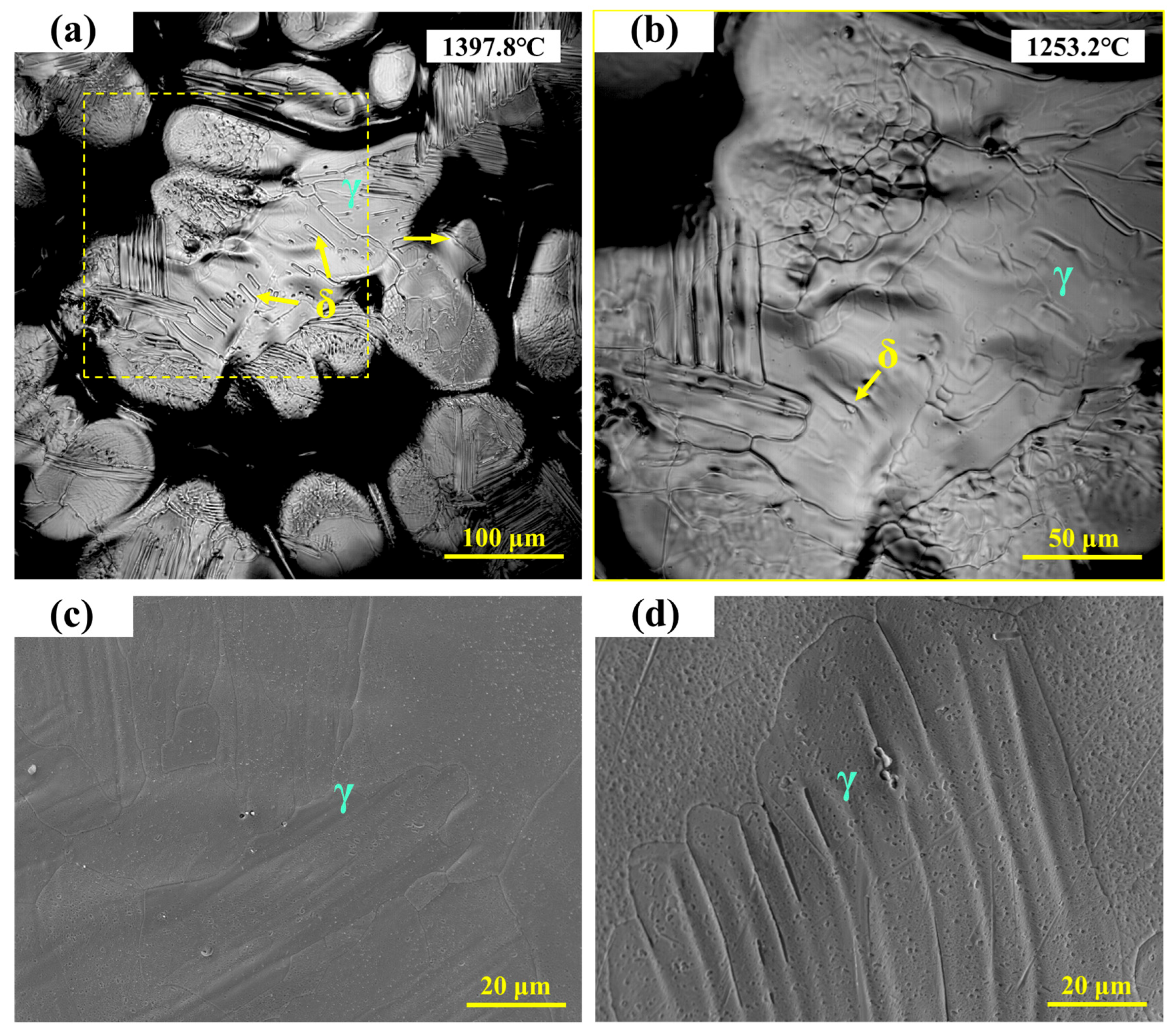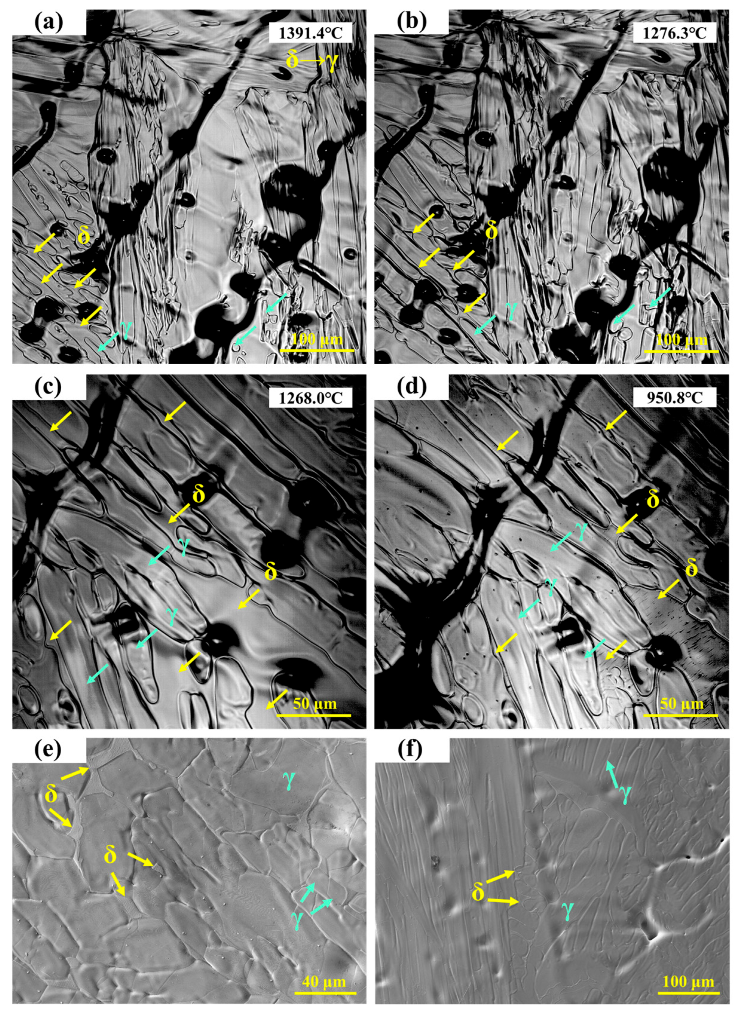 - Wang, Y.; Chen, C.; Yang, X.; Zhang, Z.; Wang, J.; Li, Z.; Chen, L.; Mu, W. Solidification Modes and Delta-Ferrite of Two Types of 316L Stainless Steels: A Combination of as-Cast Microstructure and HT-CLSM Research. J. Iron Steel Res. Int. 2025, 32, 426–436. [Google Scholar] [CrossRef]