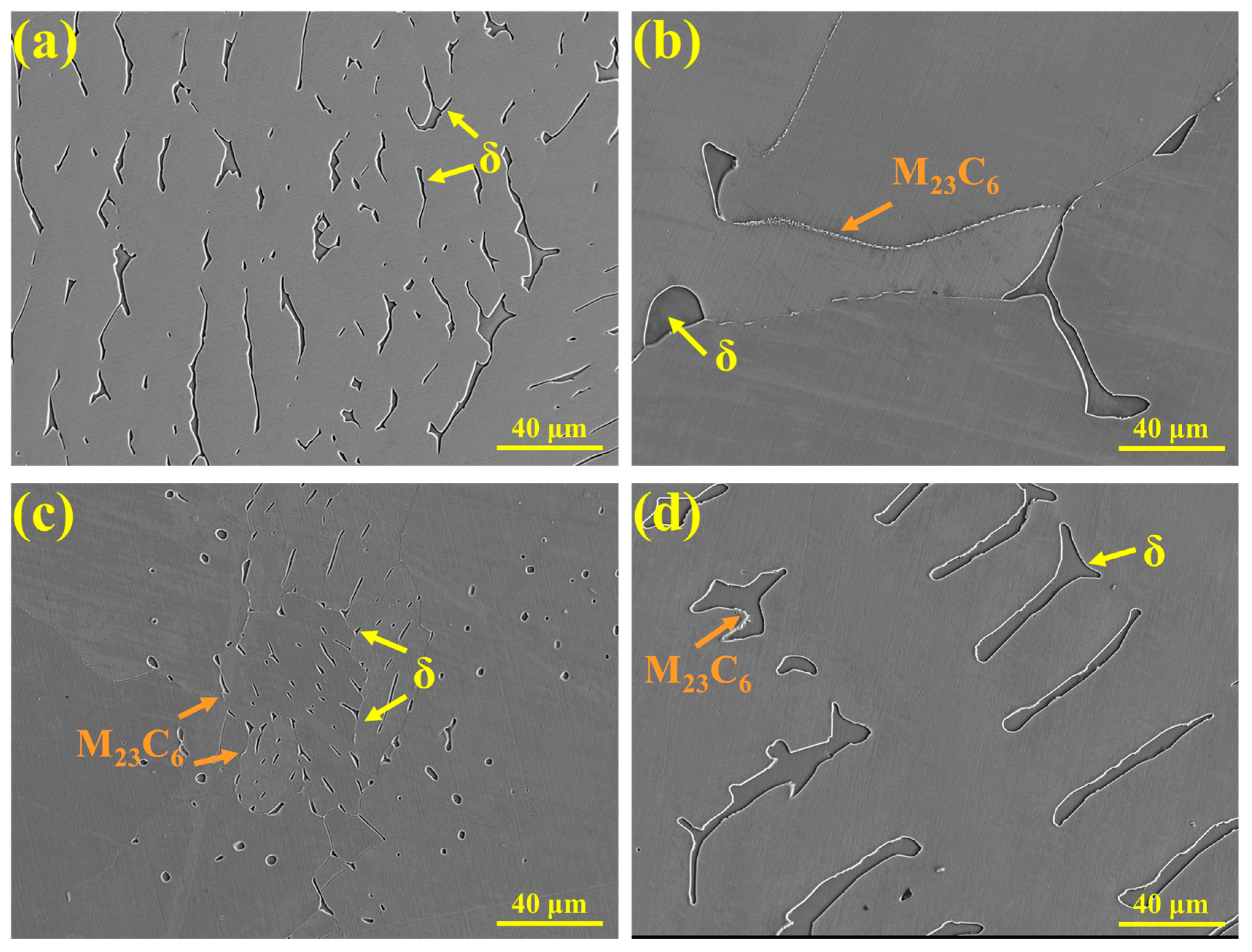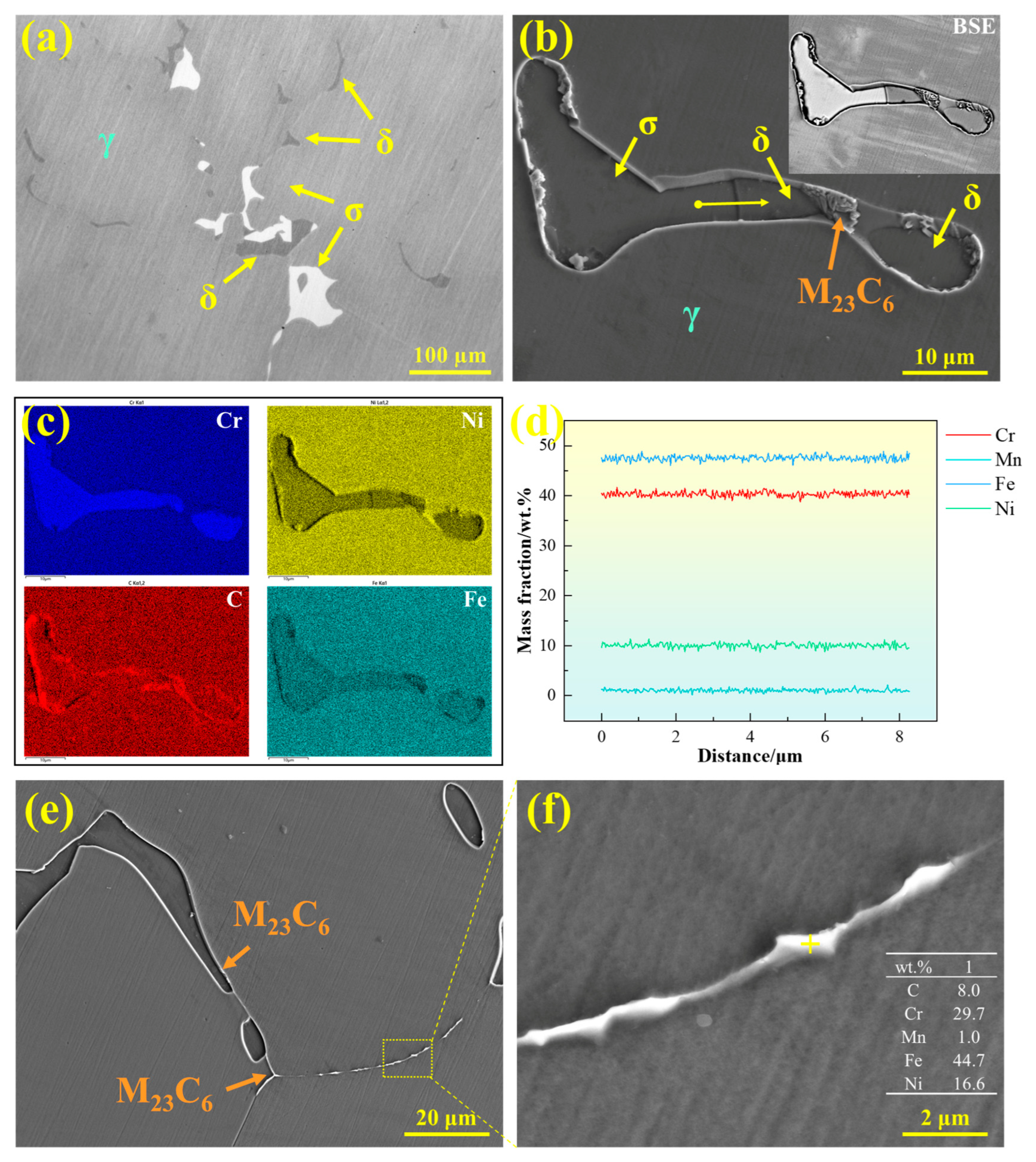 - Both thermodynamic calculations and experimental results indicate that, compared with 304 stainless steel, 310S stainless steel exhibits a lower δ-ferrite content and a significantly higher σ-phase fraction. The σ phase primarily precipitates directly from δ-ferrite (δ → σ), with a chemical composition similar to that of δ. M23C6 carbides preferentially form at grain boundaries and δ/γ interfaces, where δ-ferrite not only provides rapid diffusion paths for Cr but also serves as nucleation sites for M23C6. At the δ/γ interface, M23C6 formation follows the eutectoid reaction: δ → M23C6 + γ. Furthermore, during the solidification of 310S stainless steel, the elemental segregation sequence is Cr > Ni > Fe, with Cr and Ni exhibiting positive segregation and Fe showing negative segregation;