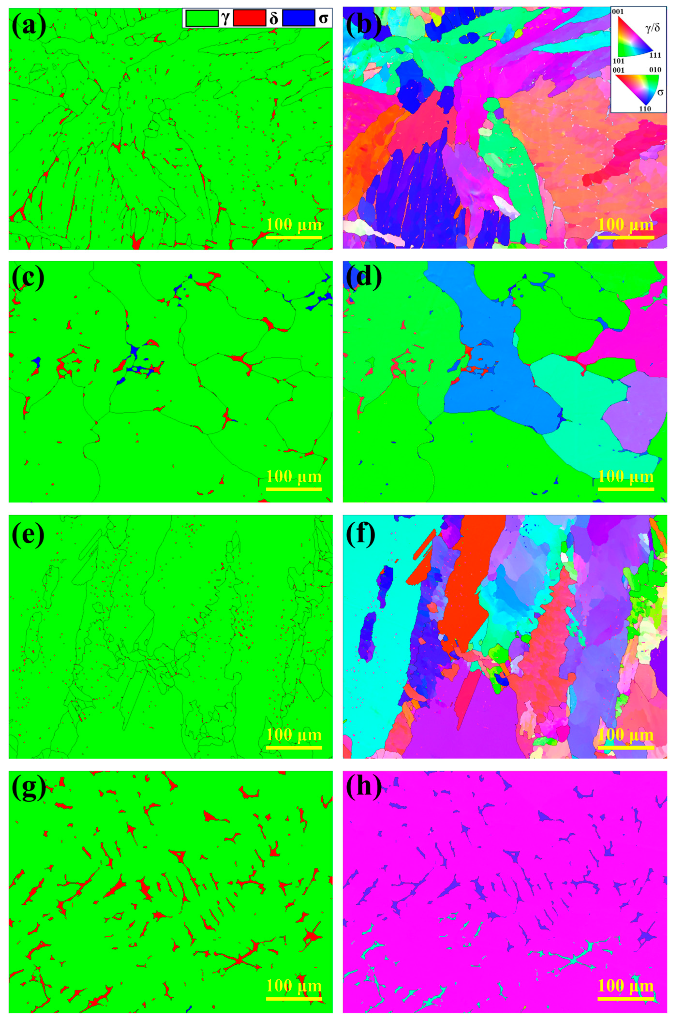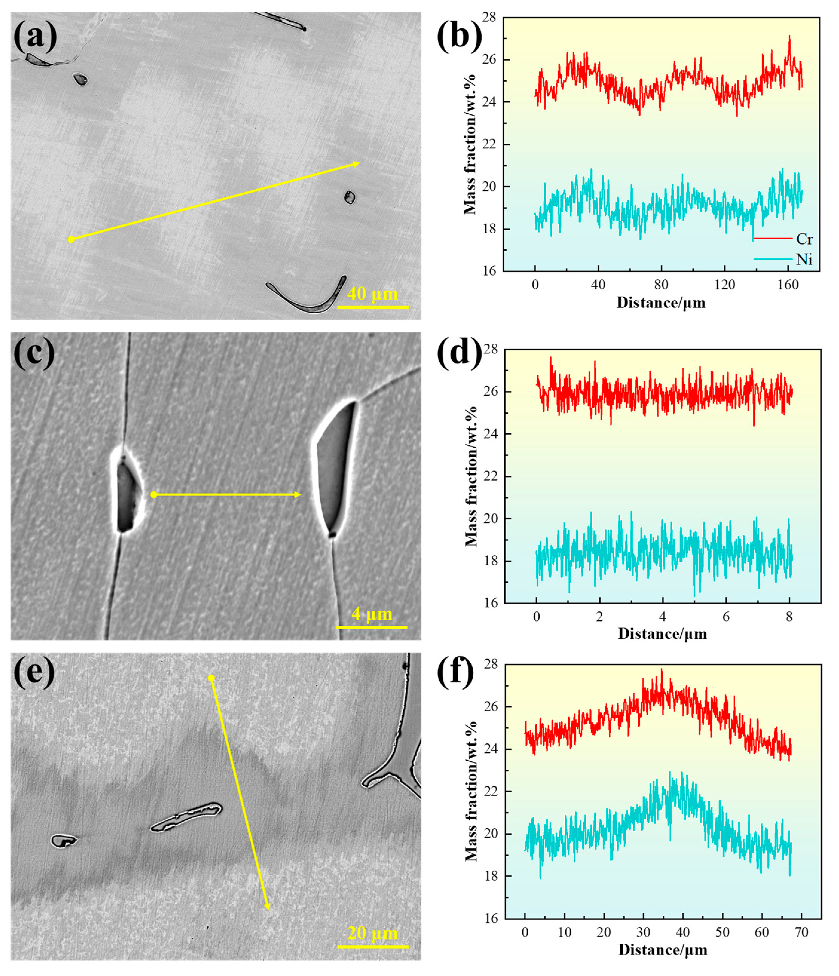 - Wang, T.; Phelan, D.; Wexler, D.; Yin, Y.; Guo, L.; Zhang, C.; Li, H. Detailed Analysis of Nucleation and Subsequent δ to γ Phase Transformation of a High N Super Austenitic Stainless Steel. Mater. Charact. 2023, 195, 112485. [Google Scholar] [CrossRef]