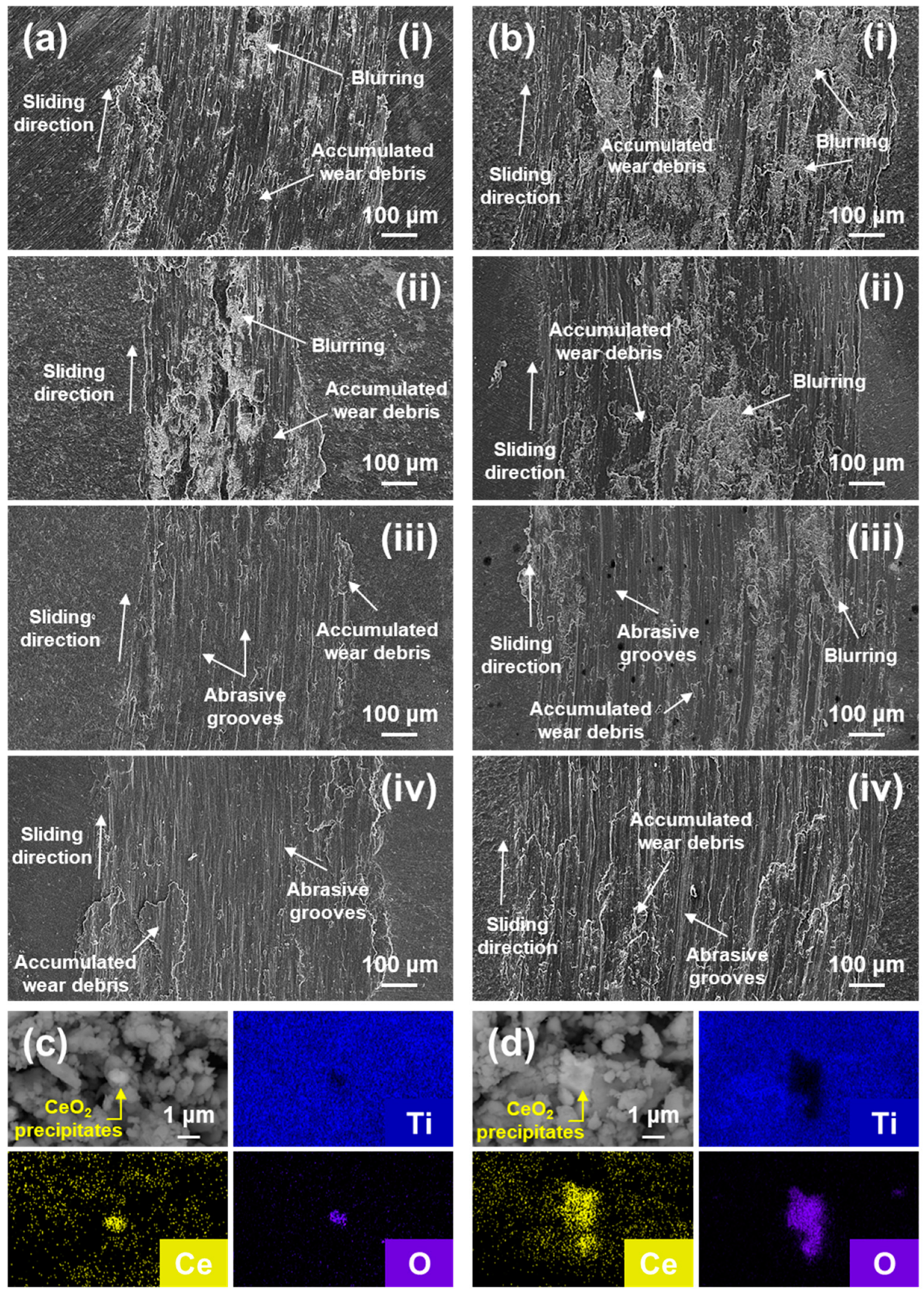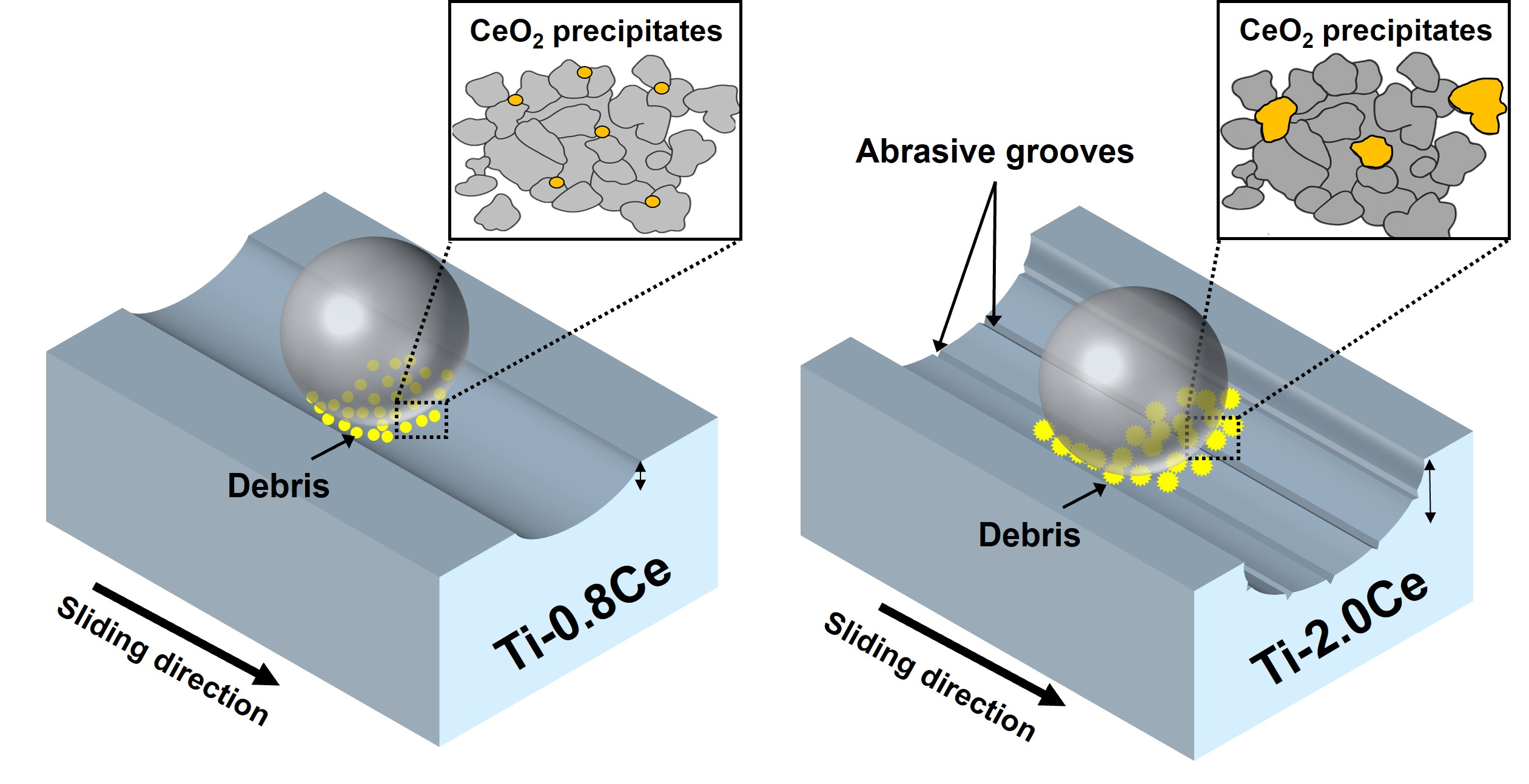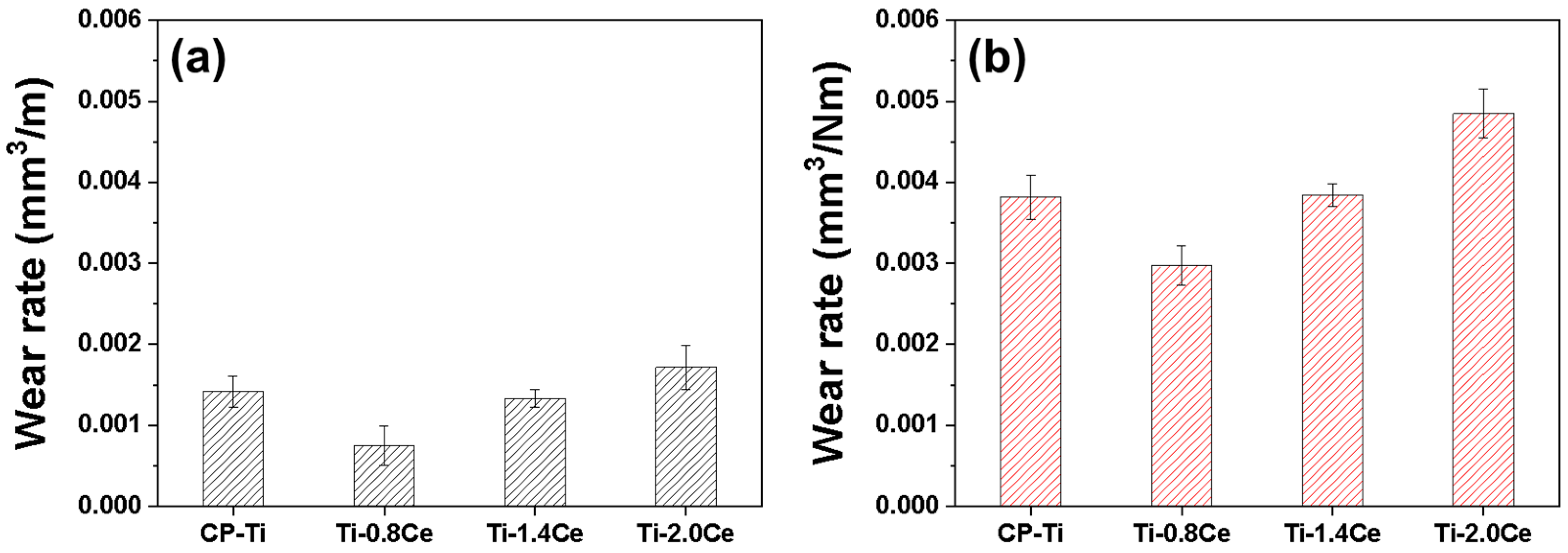 - Ti-2.0Ce, containing coarse and irregular precipitates, exhibited the highest wear rate and deepest wear track, indicating a deterioration of wear resistance with excessive Ce addition.