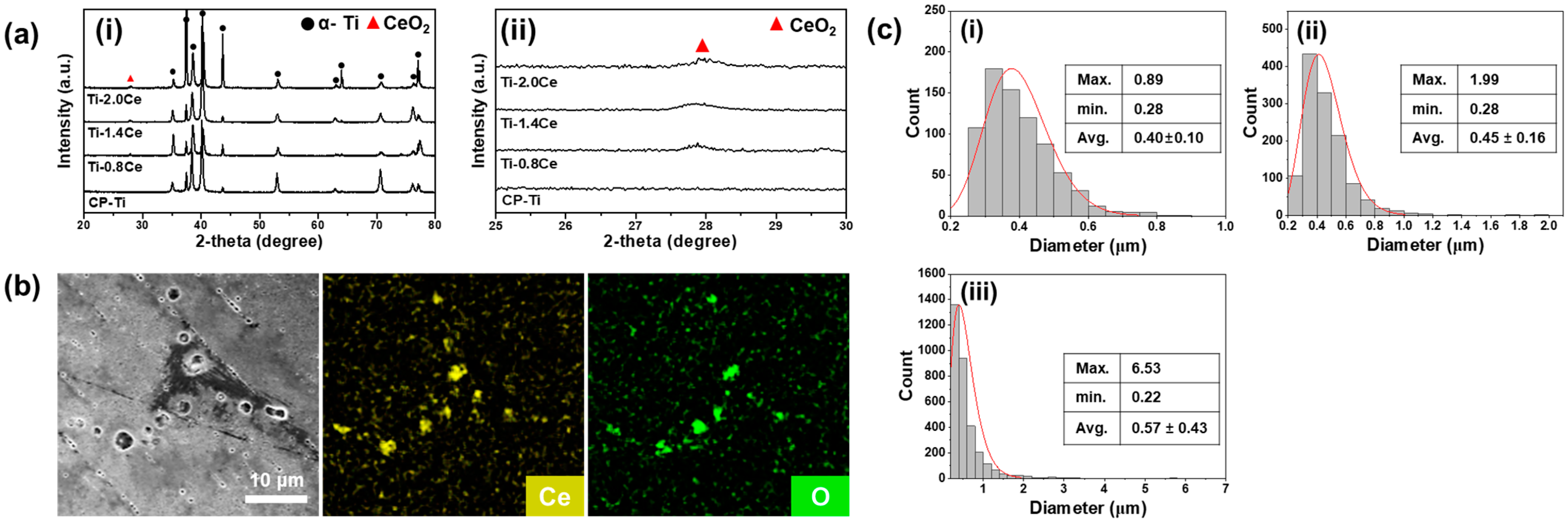 - In the Ti-1.4Ce and Ti-2.0Ce, the formation of coarser CeO2 precipitates led to increased wear rates compared to Ti-0.8Ce, despite their higher hardness than CP-Ti. This is due to third-body abrasion and composite wear behavior induced by the hard precipitates.