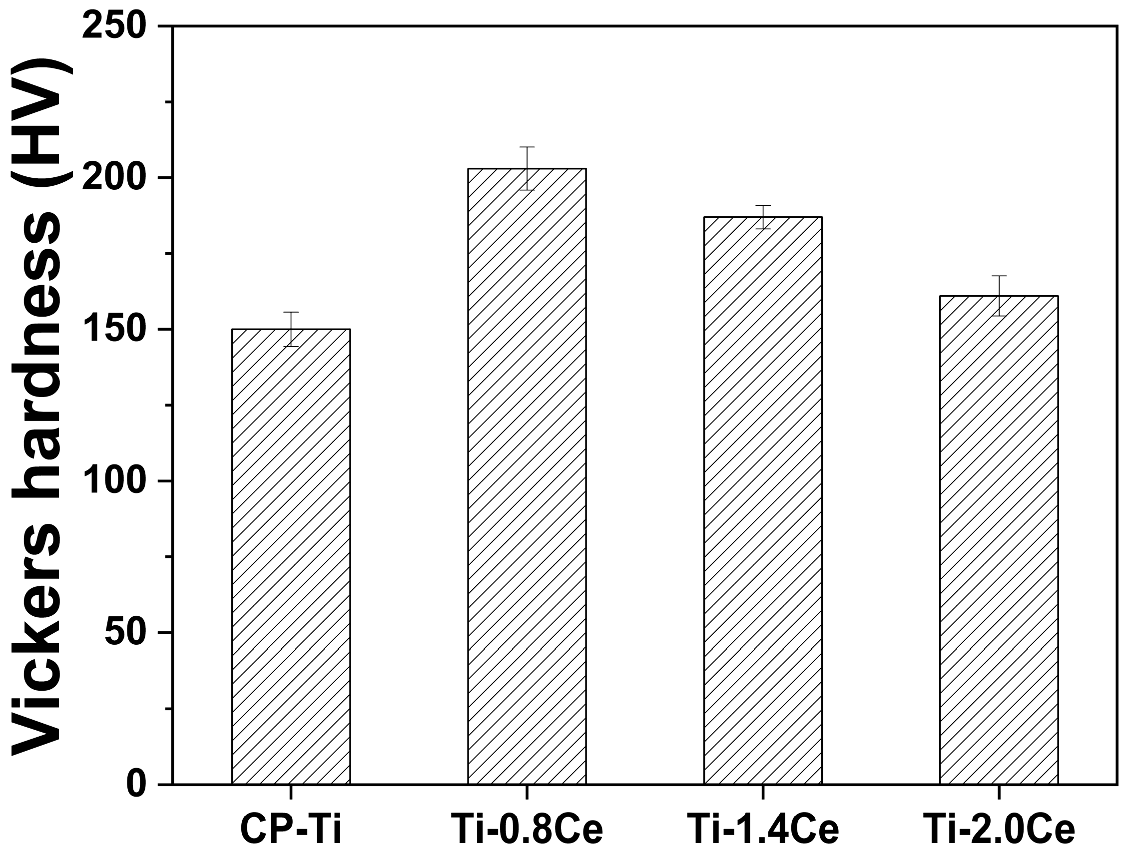 - The Ti-0.8Ce alloy showed the highest hardness and lowest wear rate, achieving reductions of 47.2% (1 N) and 22.2% (5 N) compared to CP-Ti improvements, which are attributed to the solid solution and precipitation strengthening effect of fine CeO2 precipitates.