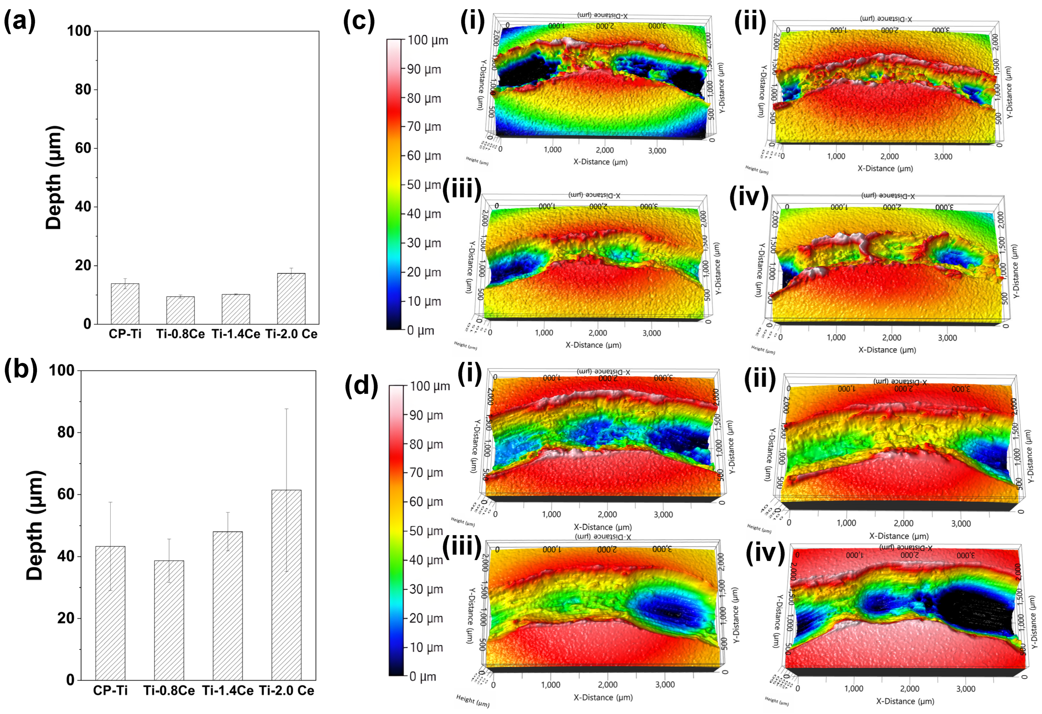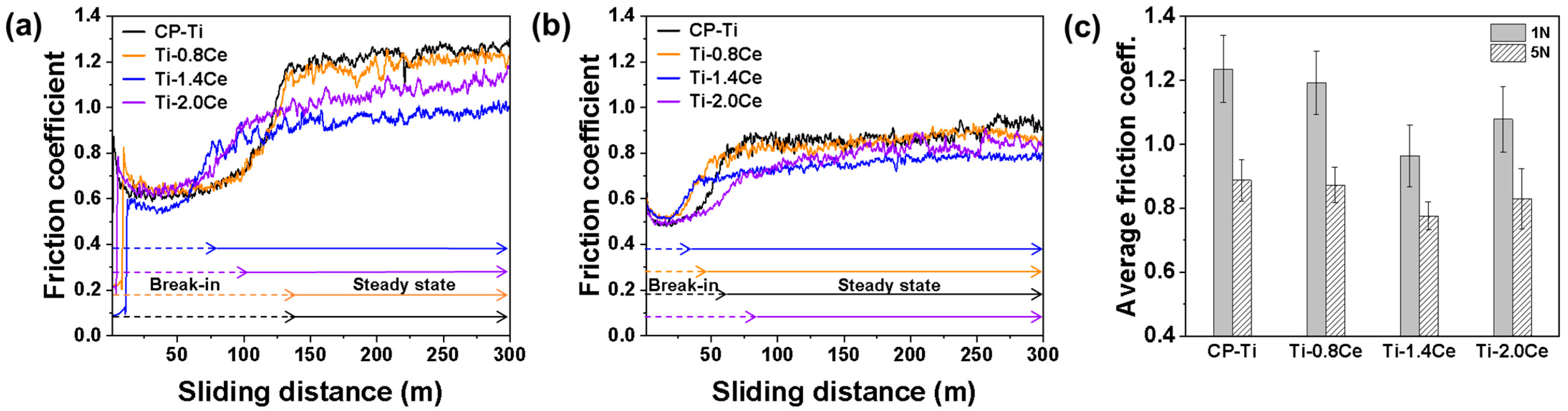 - Although Ti-1.4Ce showed the lowest average friction coefficients (0.963 at 1 N, 0.776 at 5 N), this was a result of increased abrasive interaction with the precipitates rather than improved wear resistance. The elevated material removal due to this mechanism ultimately reduced wear performance.