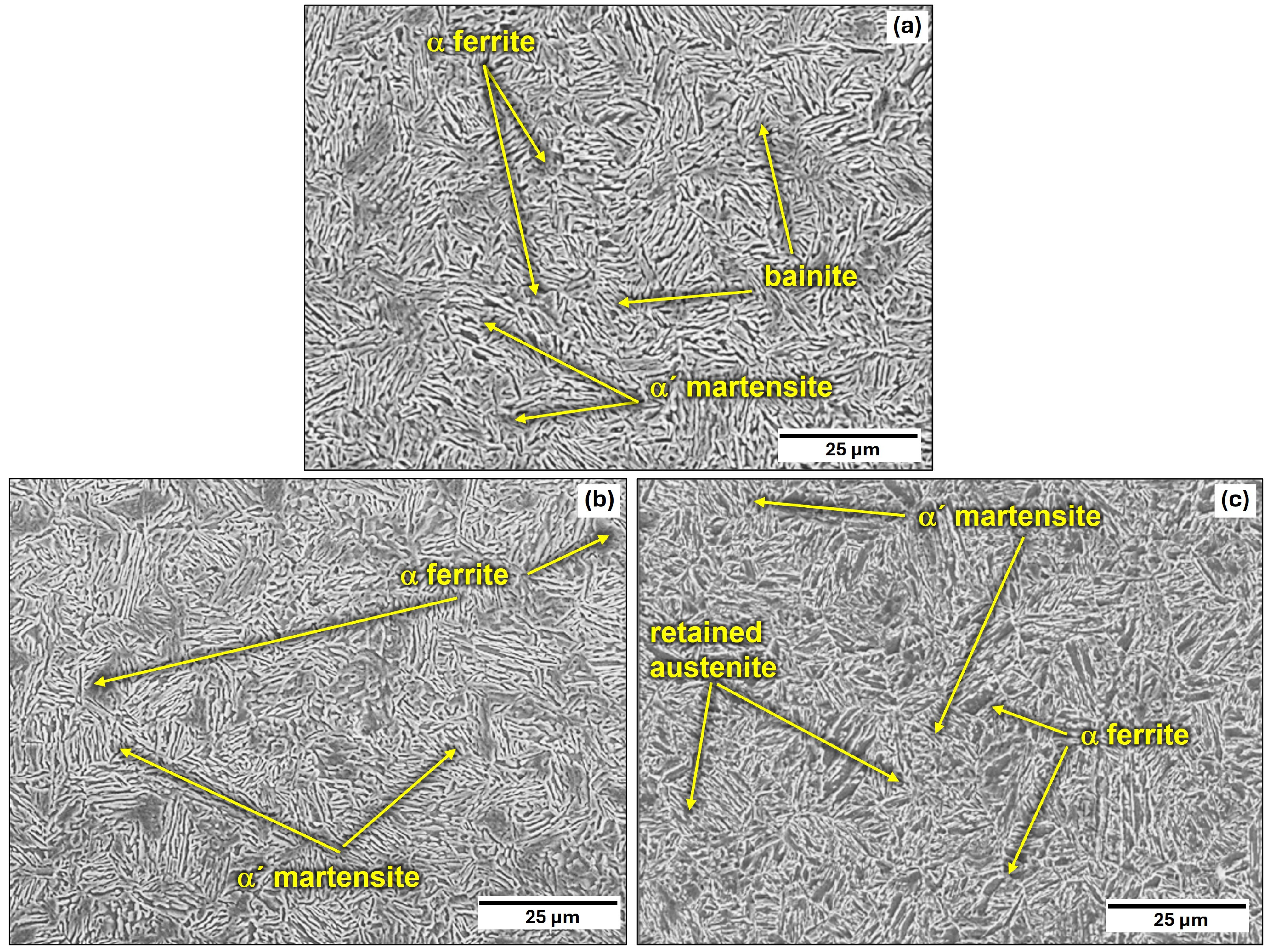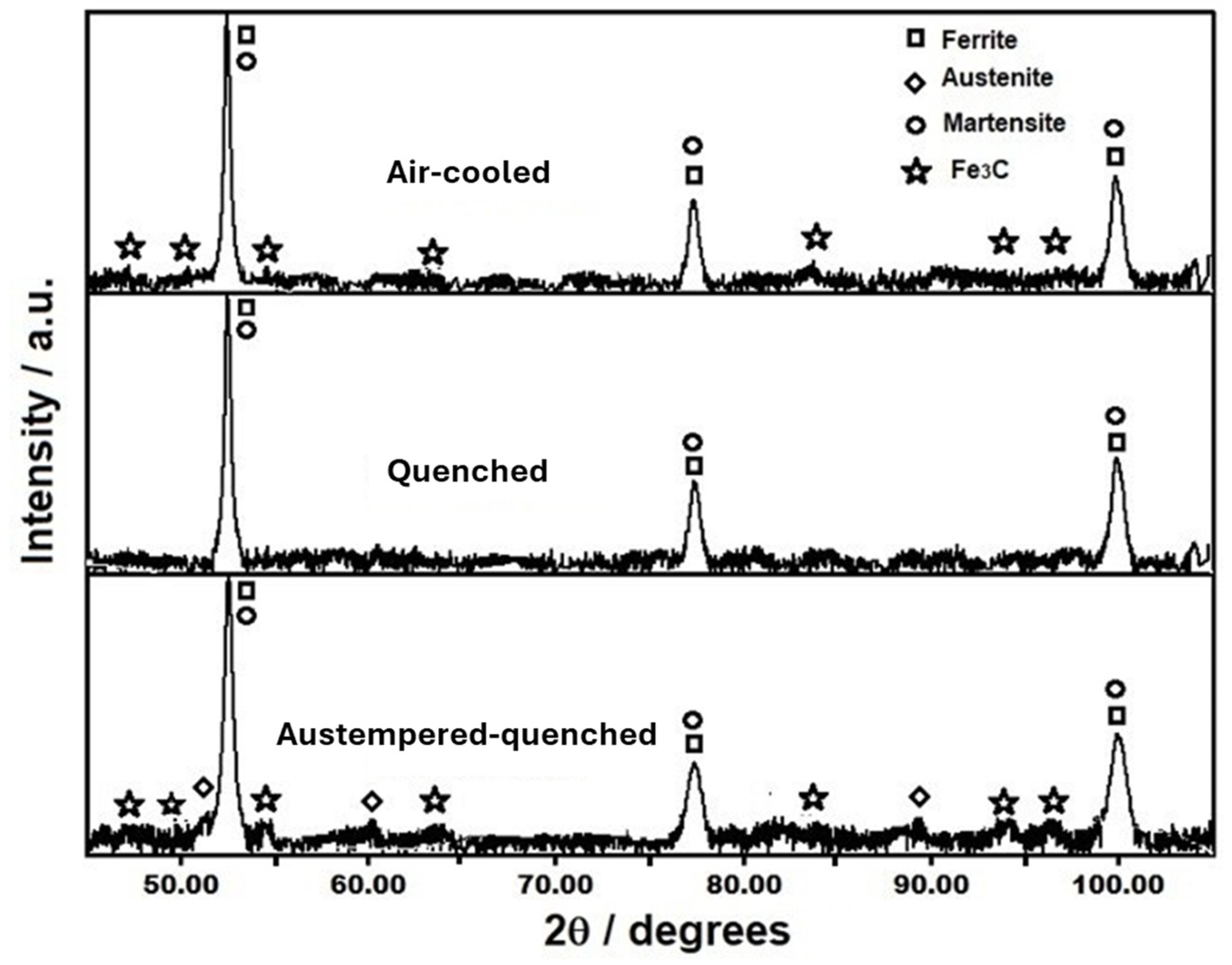 - The austempered-quenched steel, after intercritical treatment, presented a tensile strength similar to that of the quenched steel but with more ductility, which is attributable to the stabilization of retained γ austenite associated with the high Si and Mn content.